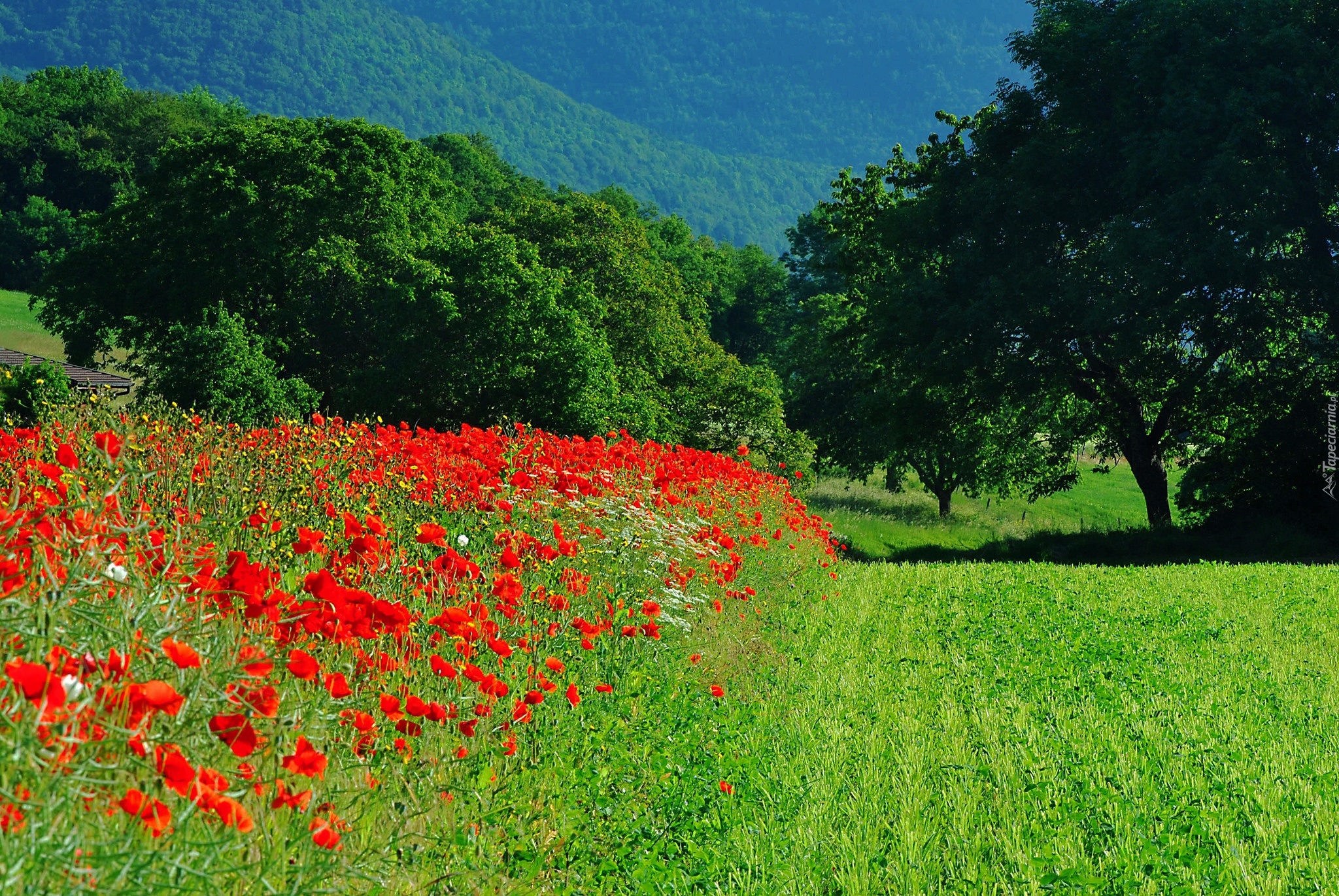Edytor tapety: Wzgórze, Pole, Maki, Drzewa, Lato