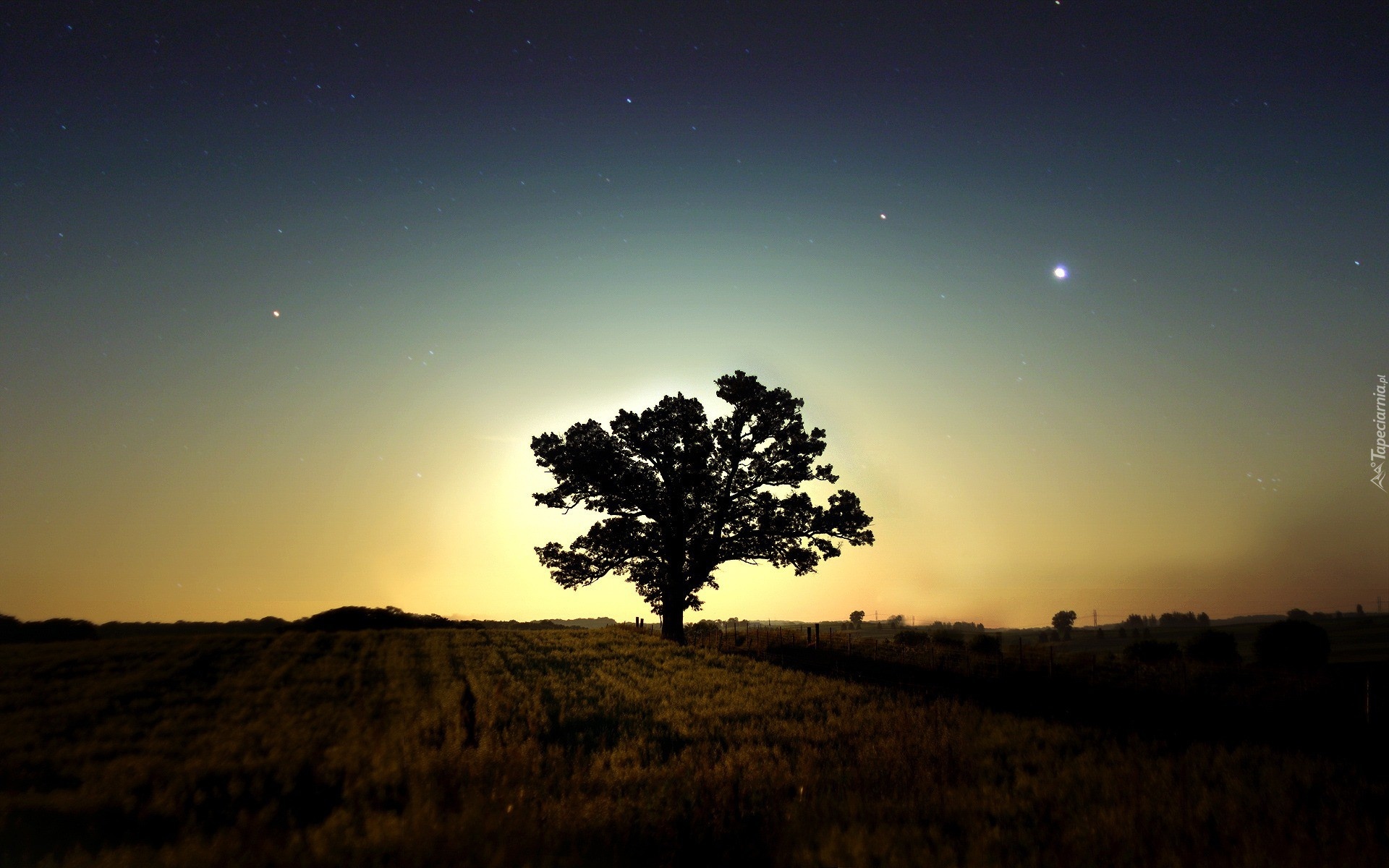 Edytor tapety: Zachód, Słońca, Łąka, Drzewo