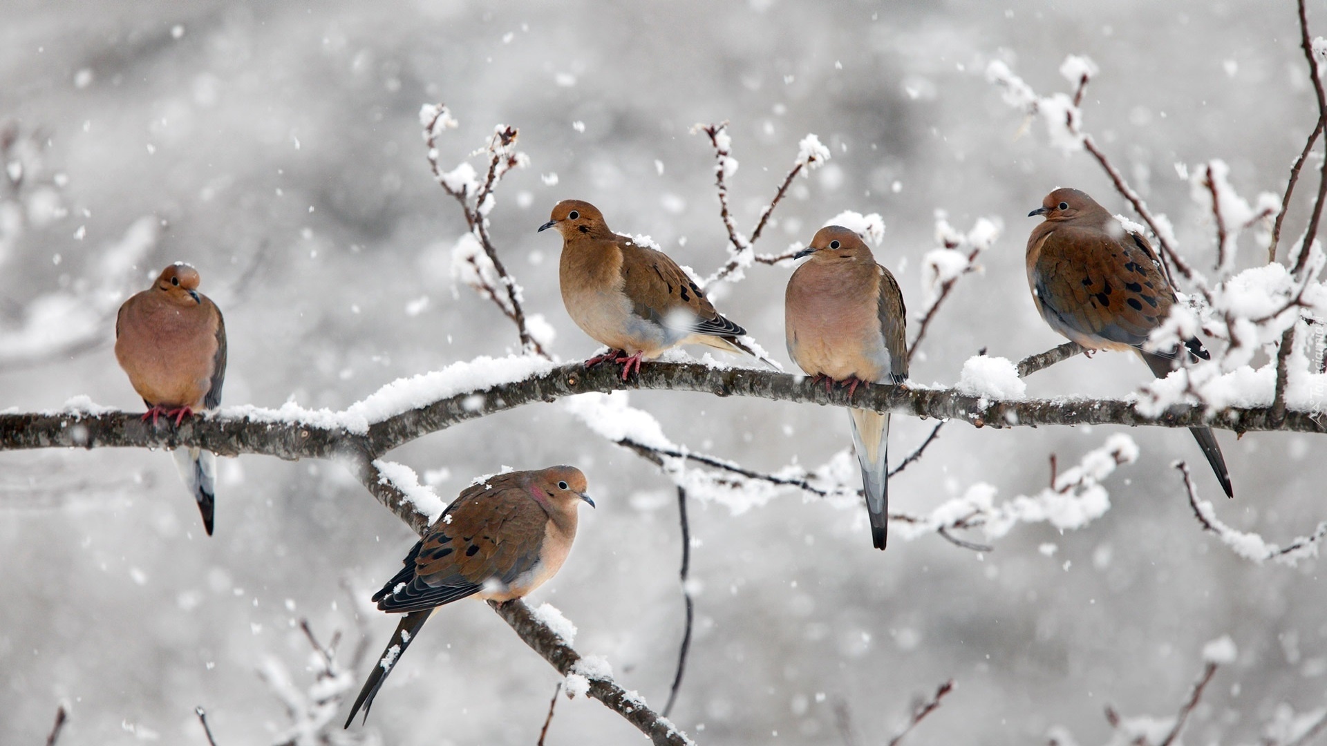 Edytor tapety: Zima, Śnieg, Gałęzie, Drzewo, Ptaki, Gołębie