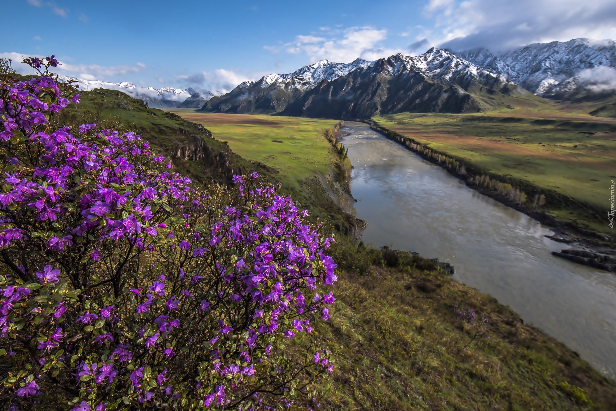 Edytor tapety: Góry, Rzeka, Pola, Kwitnący, Krzew