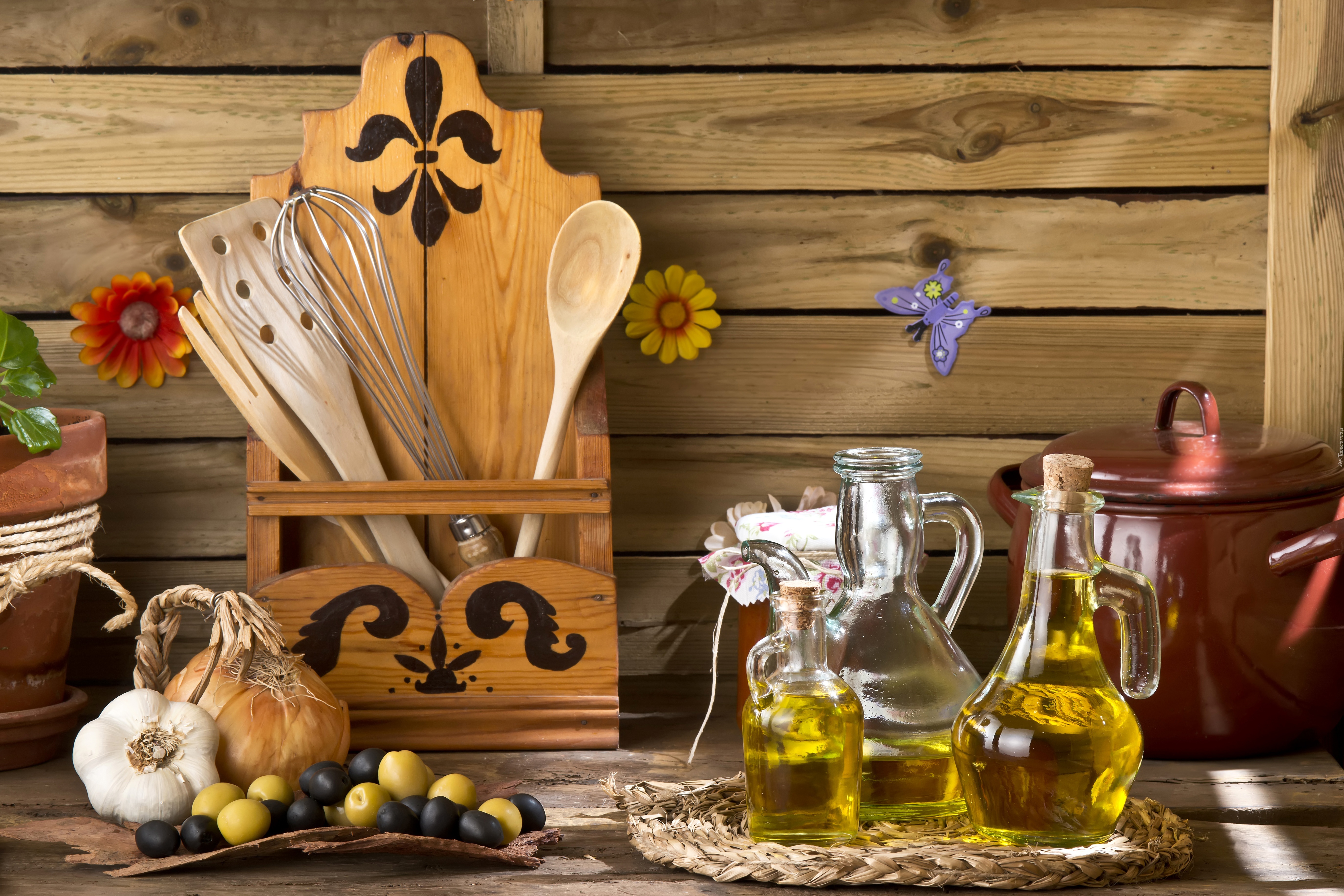 Edytor tapety: Czosnek, Śliwki, Olej, Garnek, Zestaw kuchenny