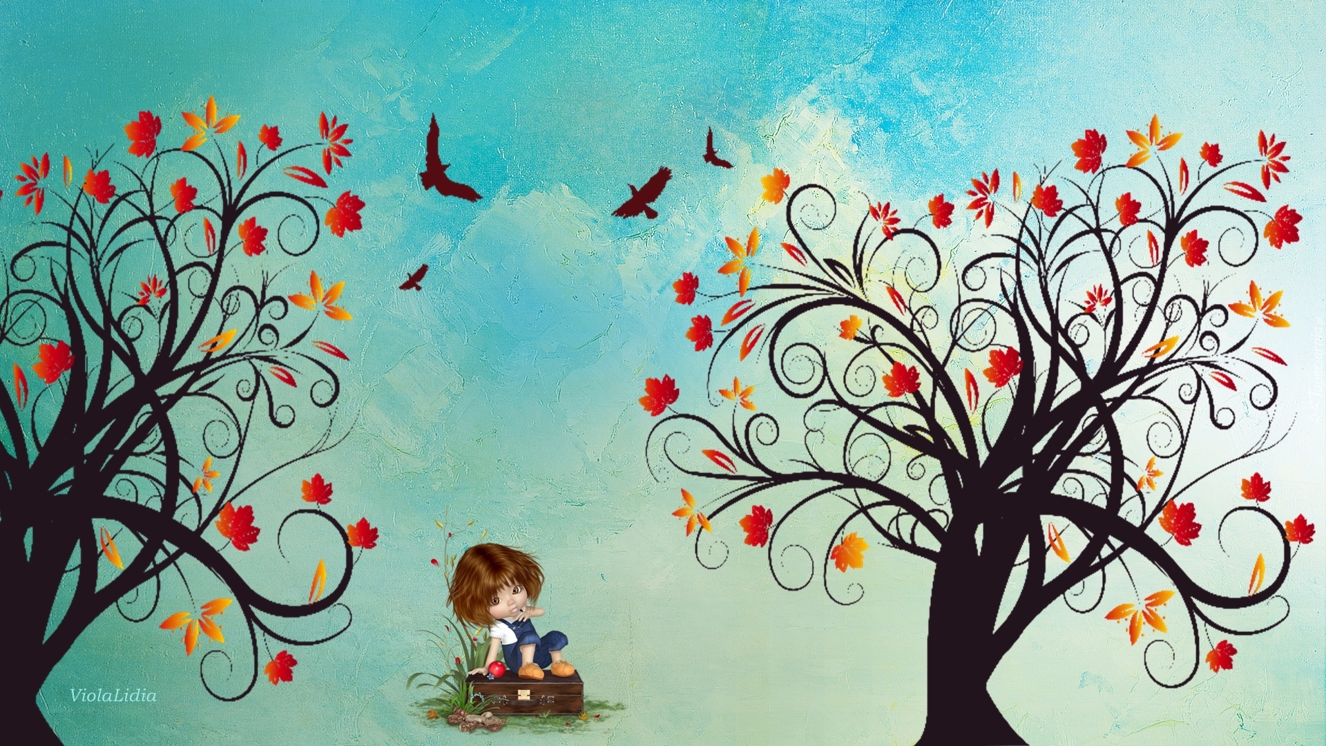 Edytor tapety: Grafika, Drzewa, Liście, Laleczka, Ptaki