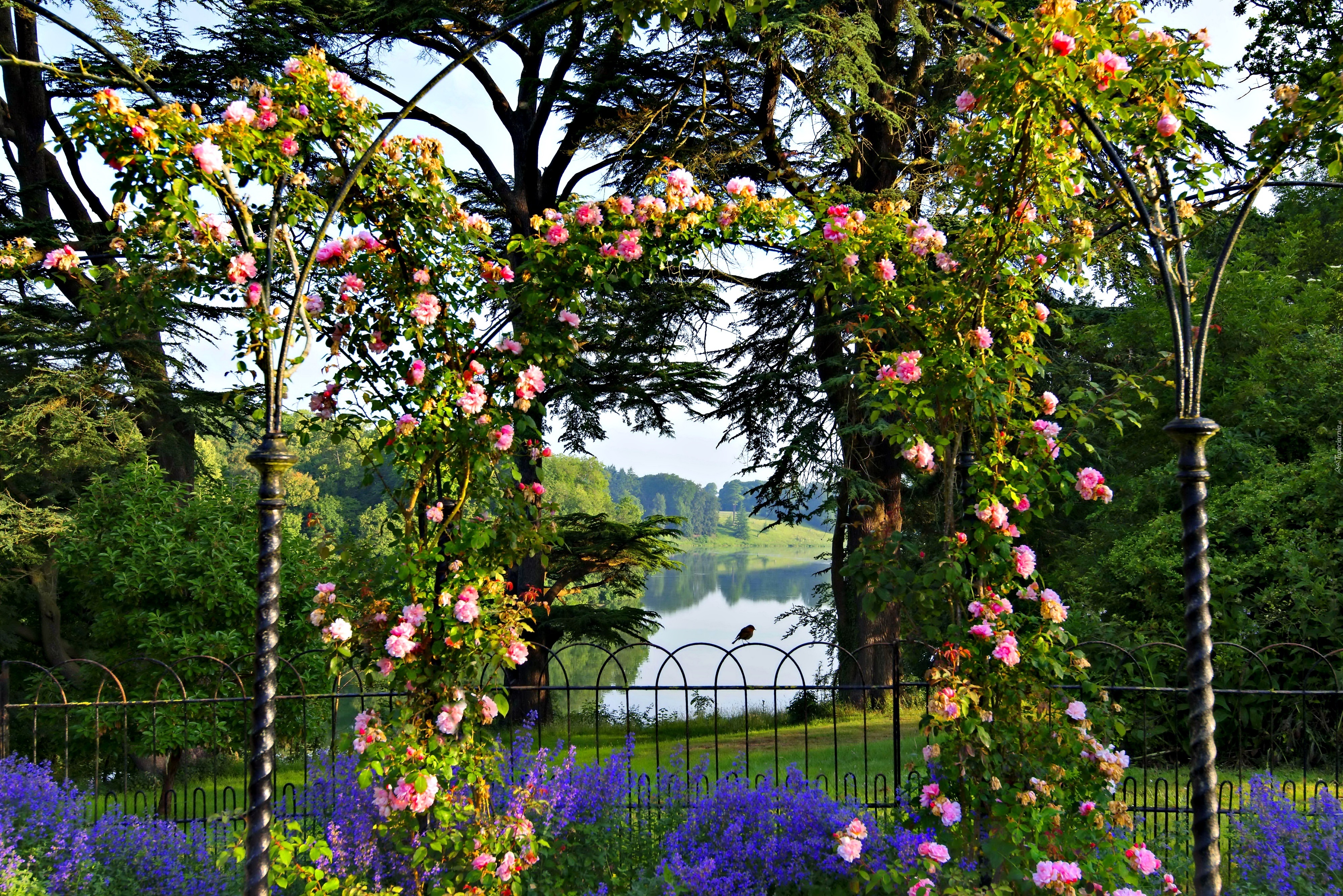 Edytor tapety: Ogród, Kwiaty, Pergola, Jezioro, Krajobraz