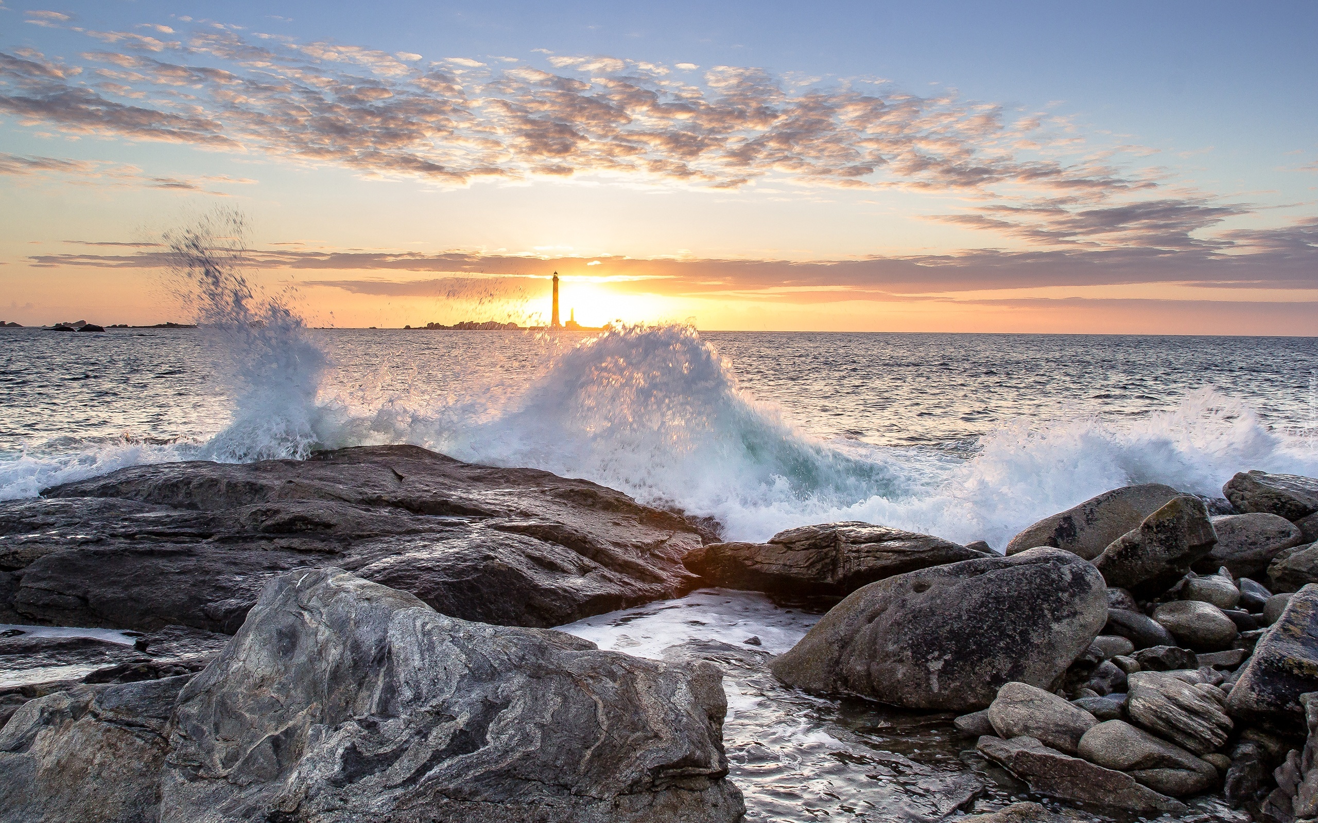 Edytor tapety: Morze, Latarnia morska, Fale, Skały, Kamienie, Wschód słońca