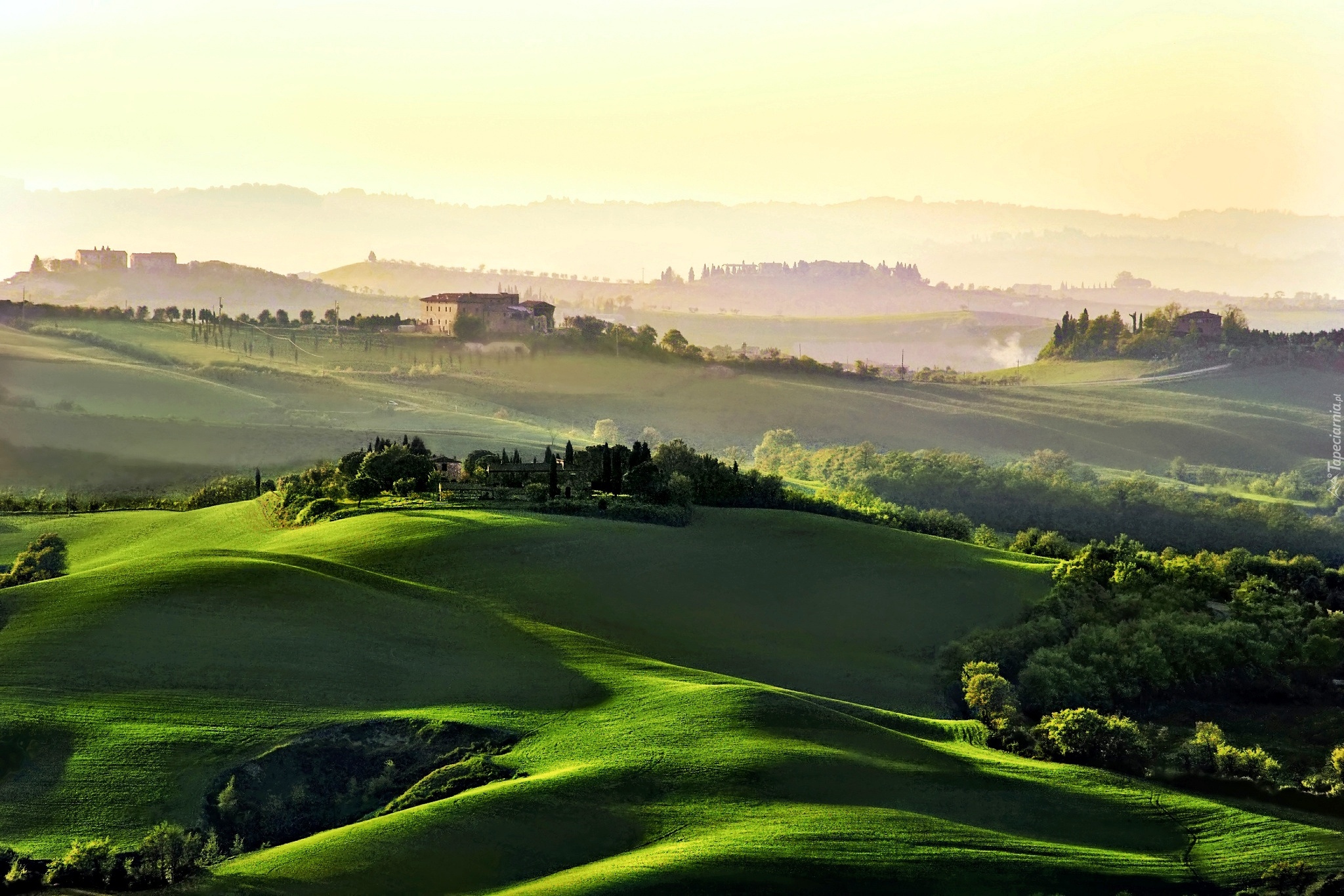 Edytor tapety: Wzgórza, Pole, Drzewa, Domy