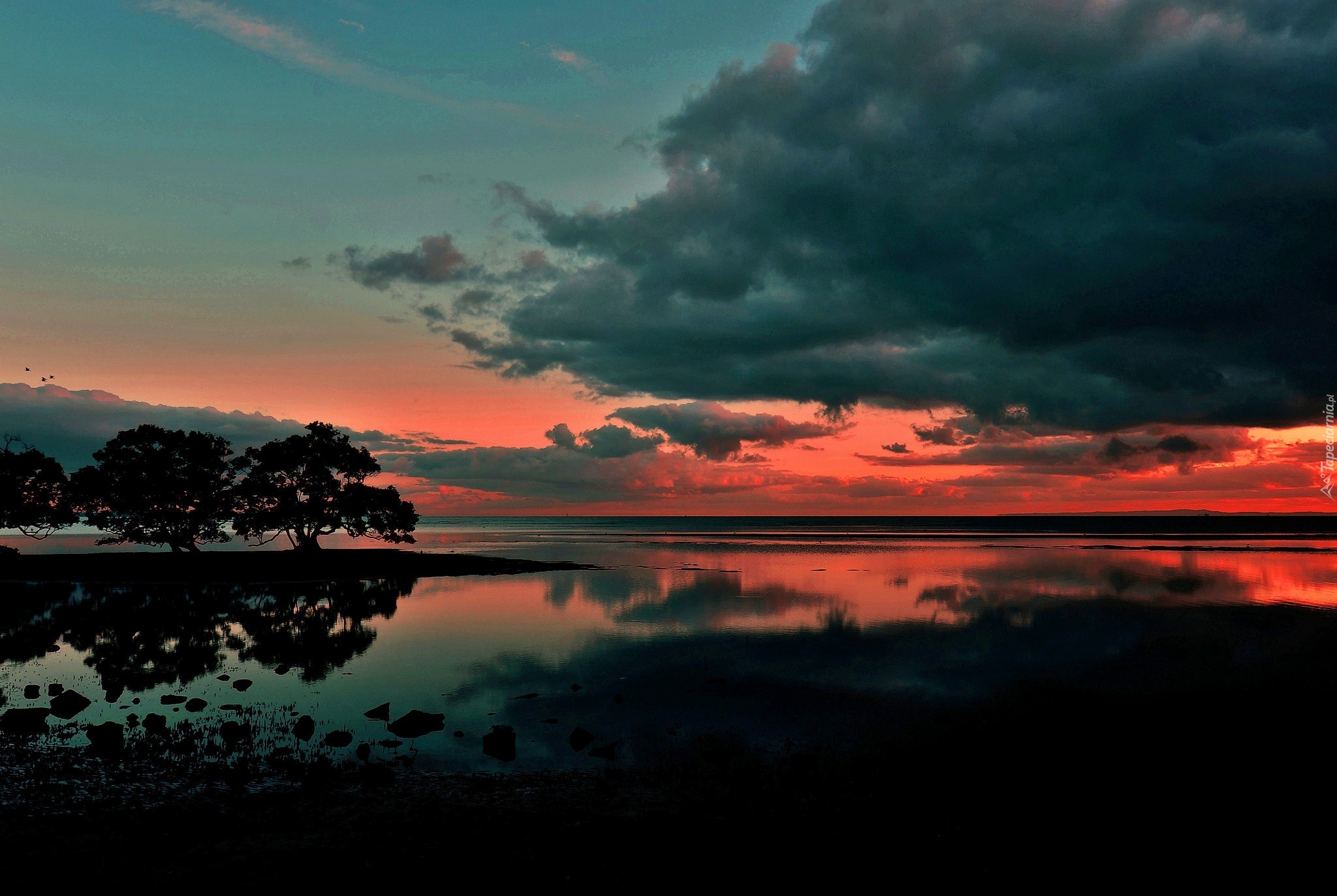 Edytor tapety: Jezioro, Drzewa, Chmury, Zachód, Słońca, Odbicie