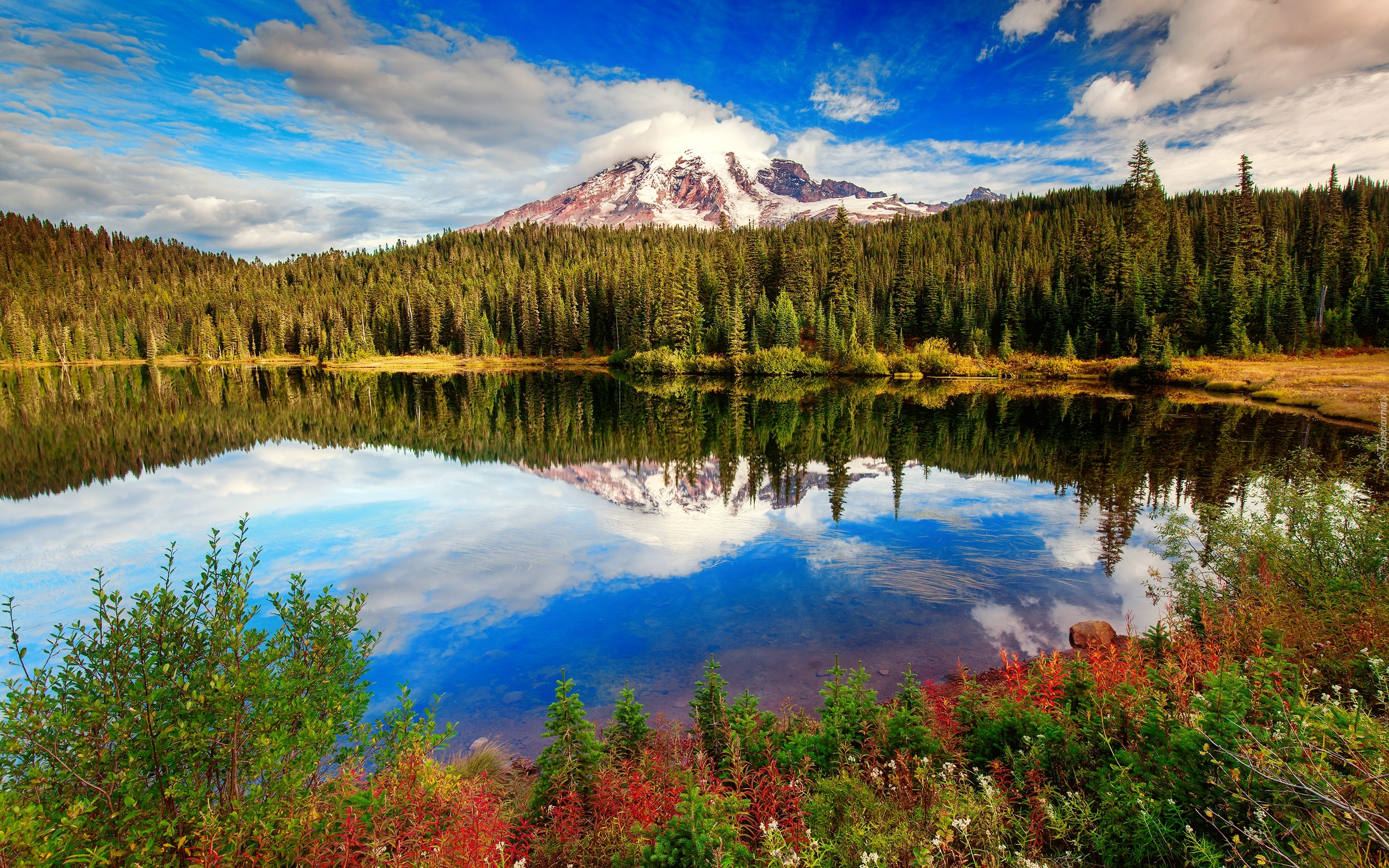 Edytor tapety: Góry, Jezioro, Las, Chmury, Kwiaty