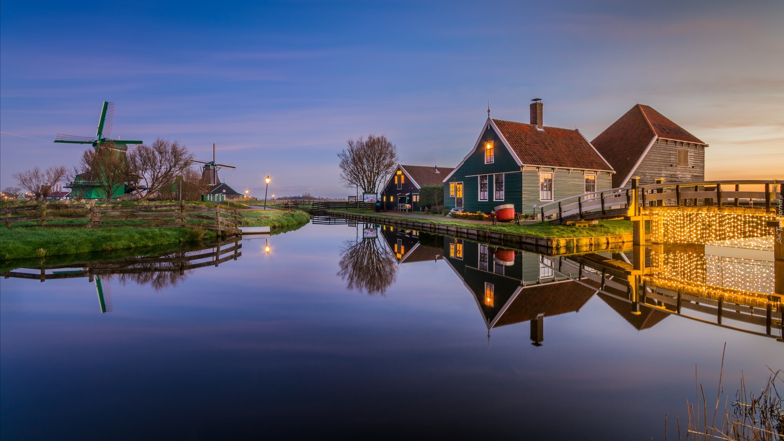 Edytor tapety: Holandia, Noc, Domy, Rzeka, Wiatraki