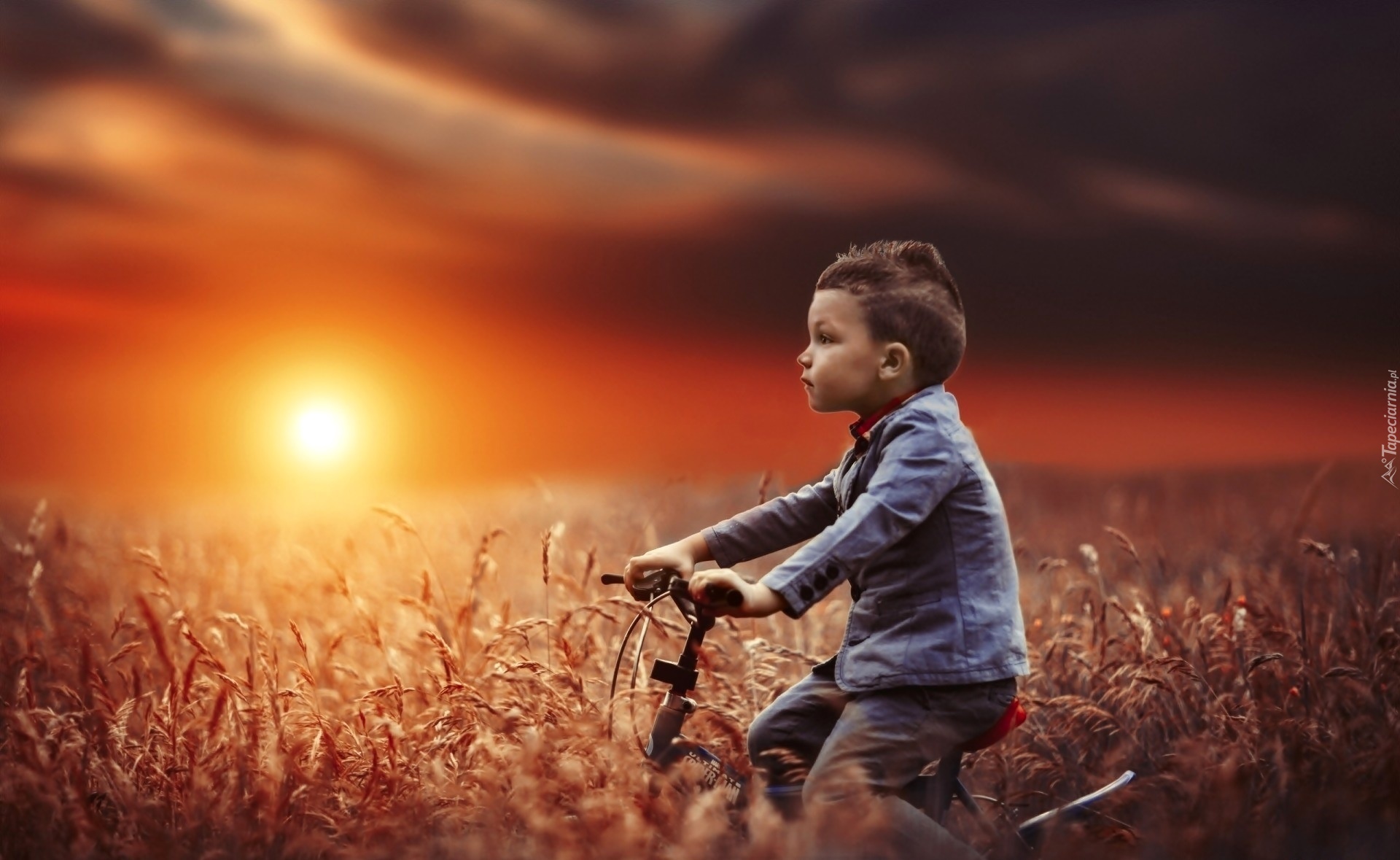 Edytor tapety: Chłopiec, Rower, Trawa, Zachód, Słońca