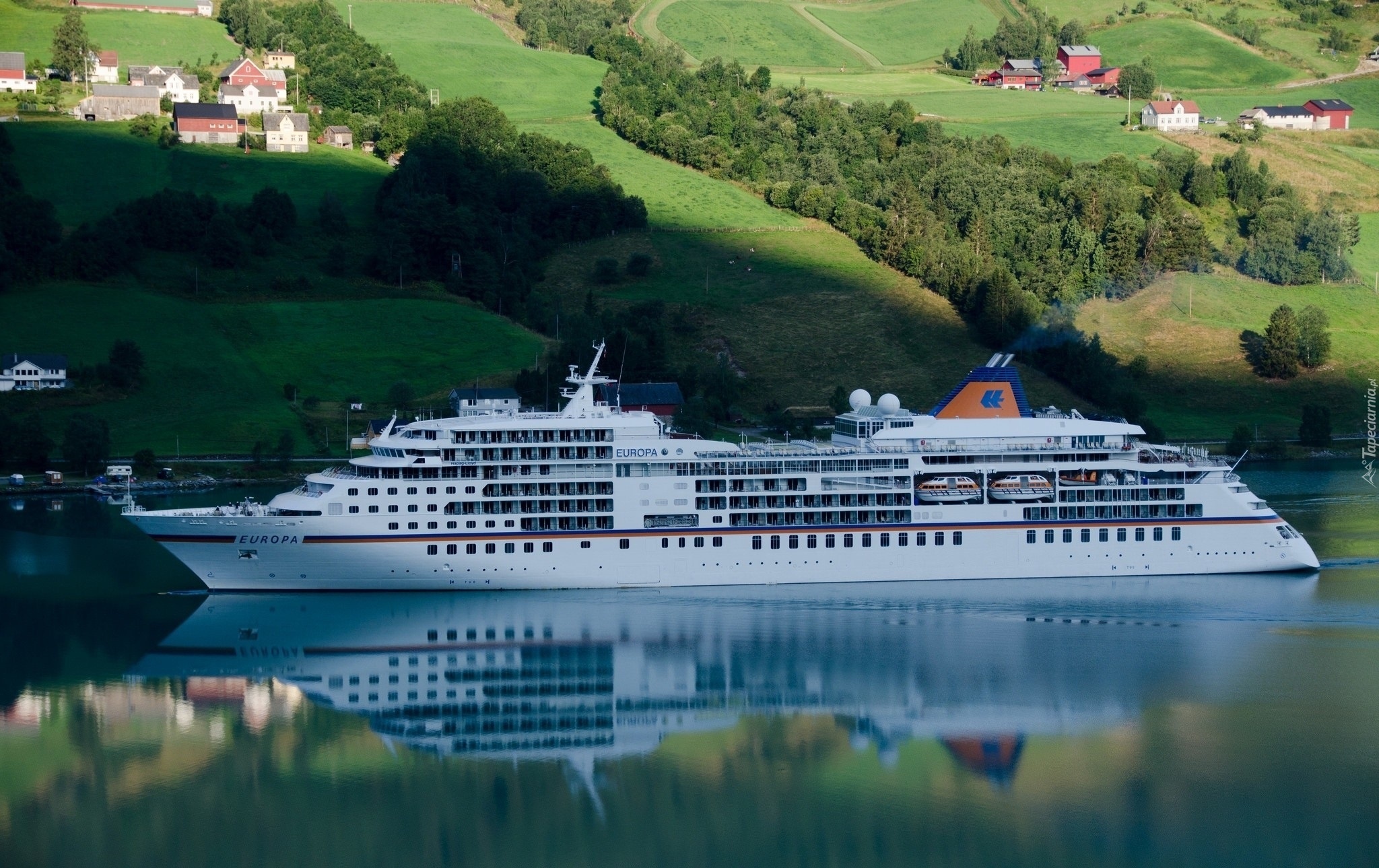 Edytor tapety: Rzeka, Statek, Pasażerski, Wzgórza, Domy
