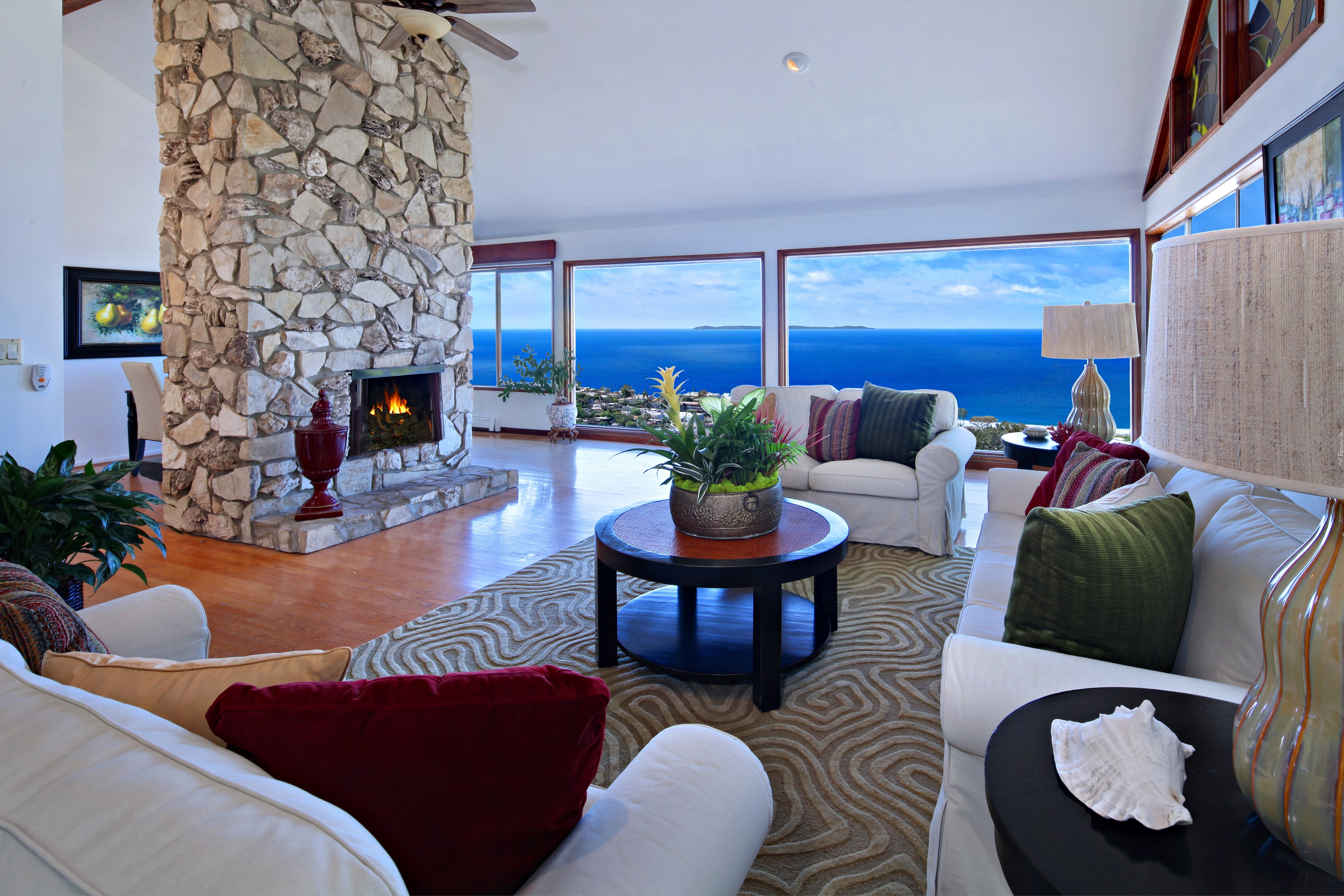 Edytor tapety: Salon, Kominek, Okna, Widok, Morze