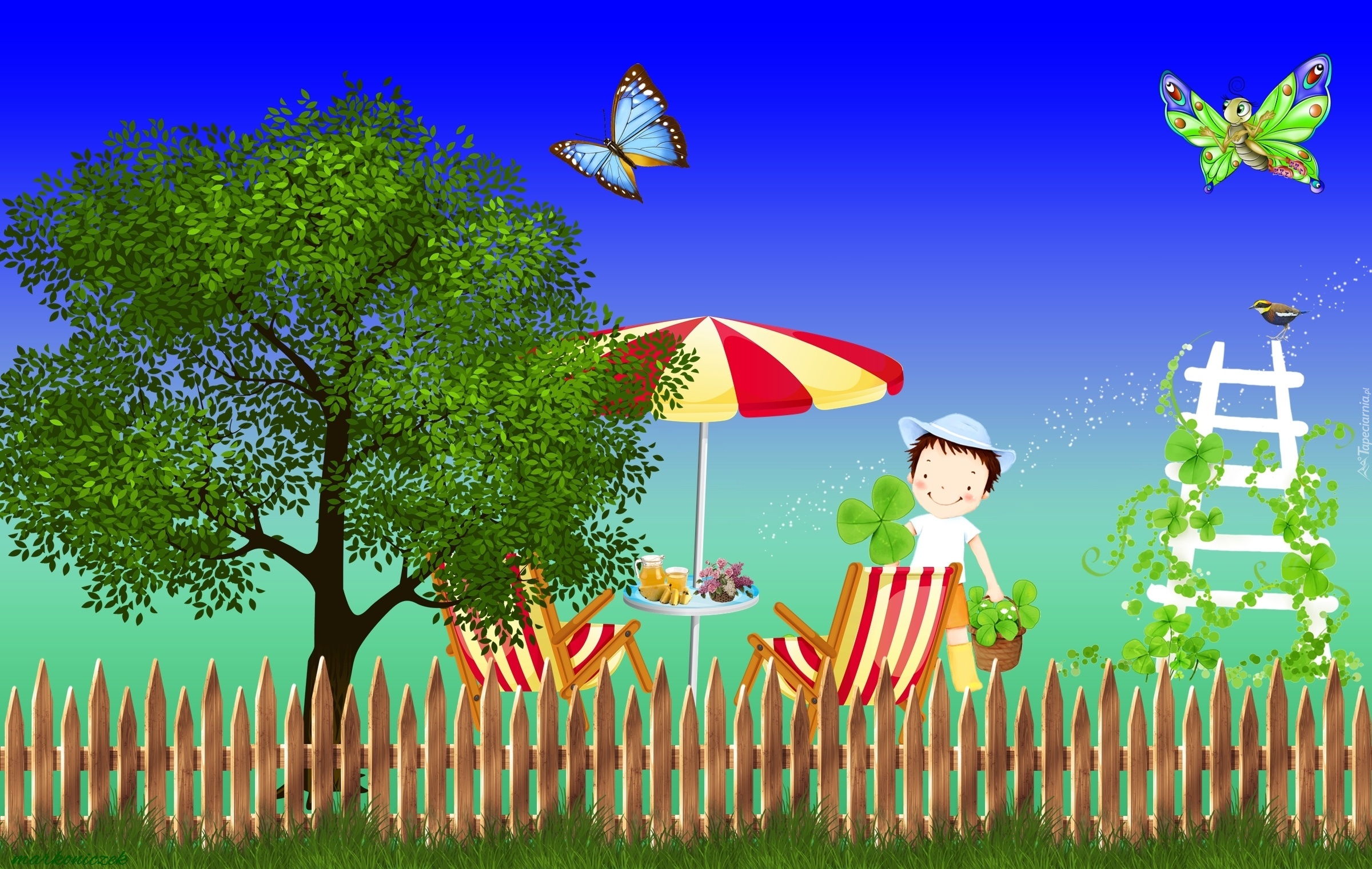 Edytor tapety: Grafika, Ogród, Drzewo, Motylki, Płot, Parasol, Stolik, Krzesła