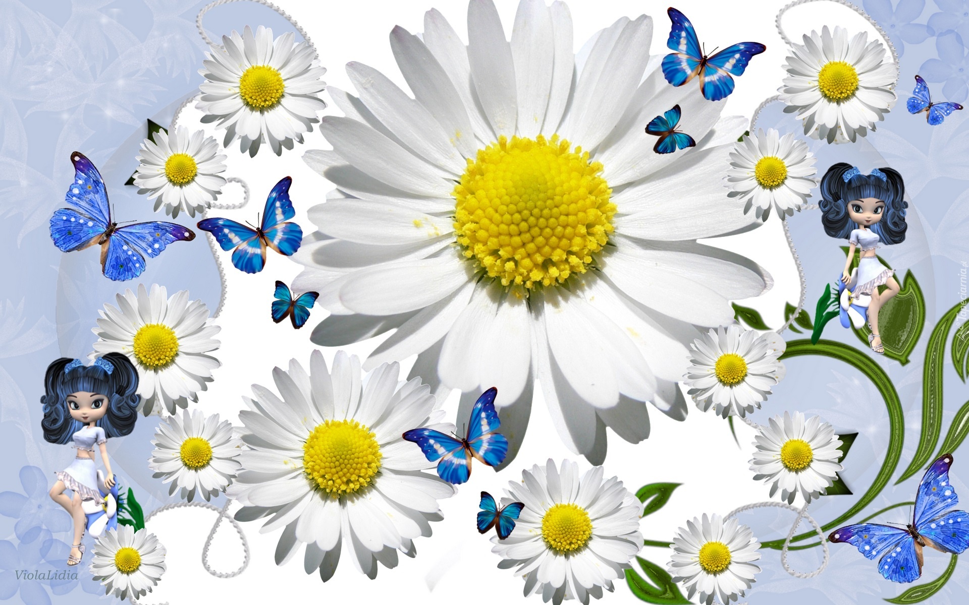 Edytor tapety: Grafika, Laleczki, Stokrotki, Motyle