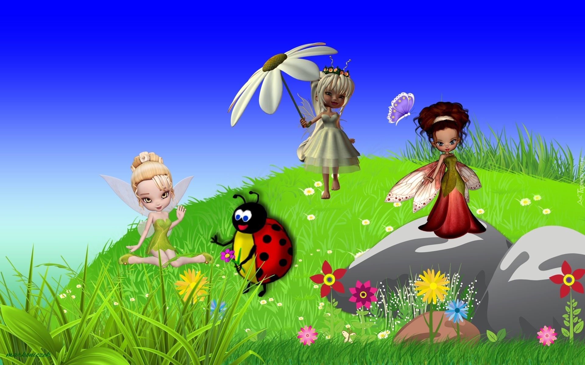 Edytor tapety: Grafika, Motylki, Łąka, Kwiaty, Biedronka