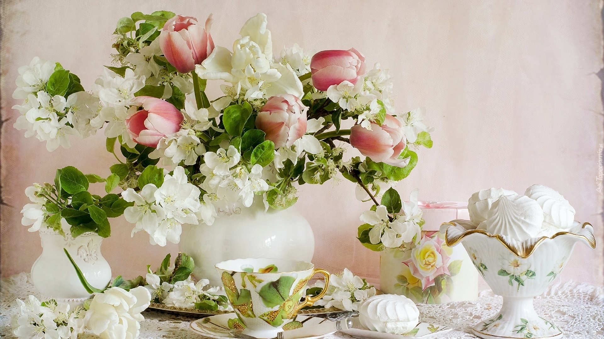Edytor tapety: Kompozycja, Kwiaty, Bukiet, Tulipany, Ciastka, Bezy