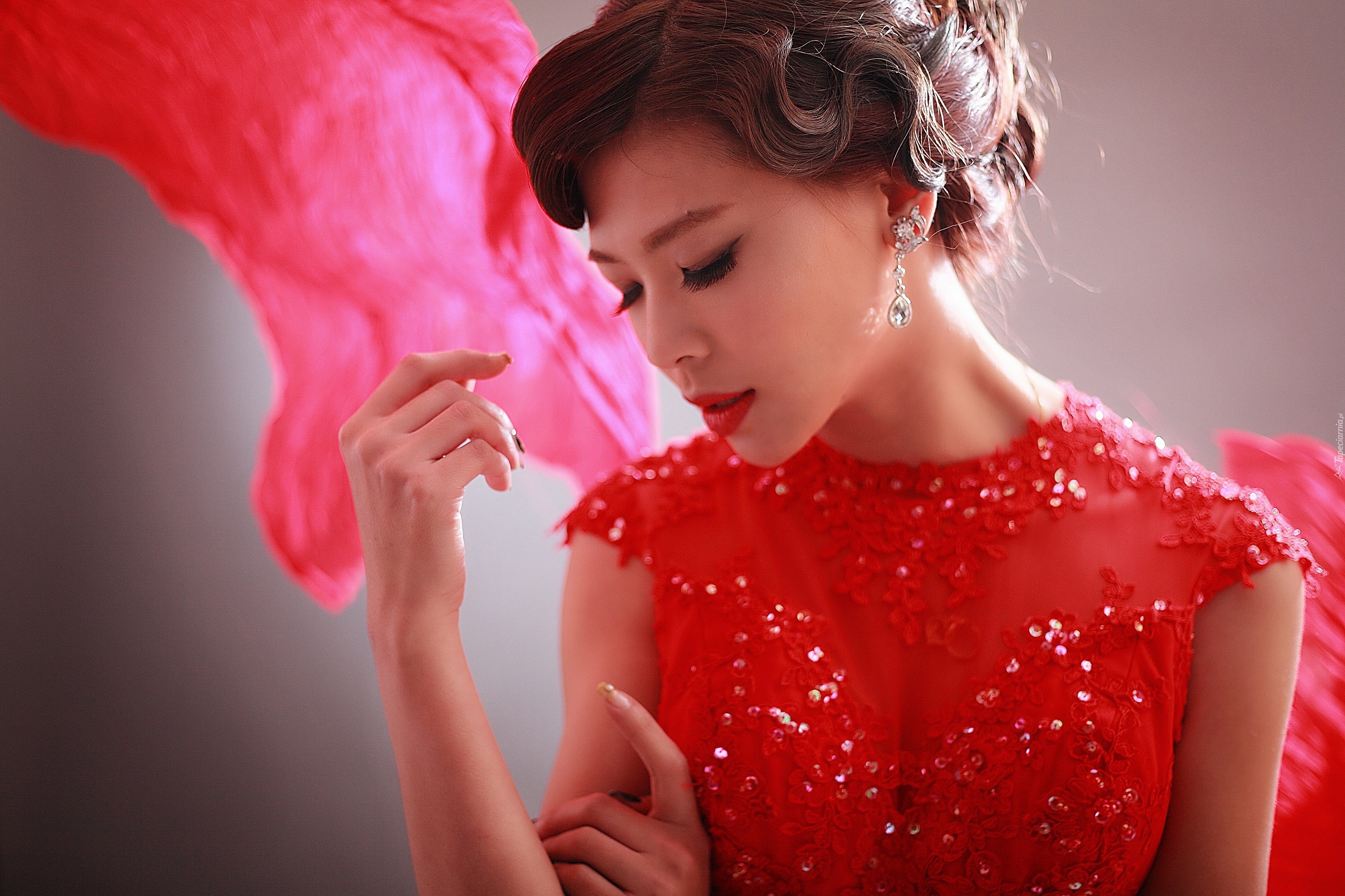 Edytor tapety: Kobieta, Suknia, Czerwona, Zamyślenie