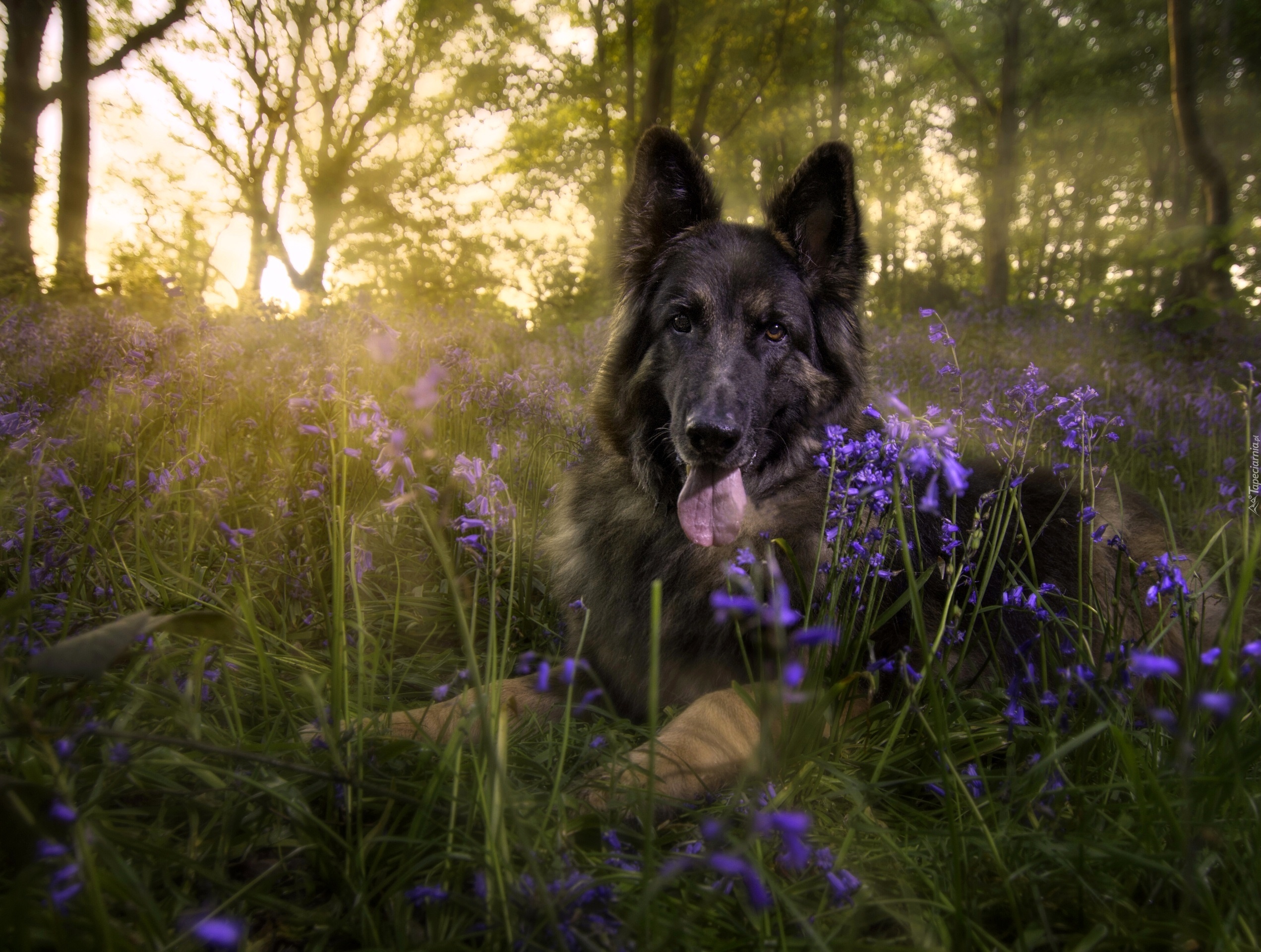 Edytor tapety: Pies, Owczarek, Niemiecki, Las, Kwiatki, Promienie, Słońca