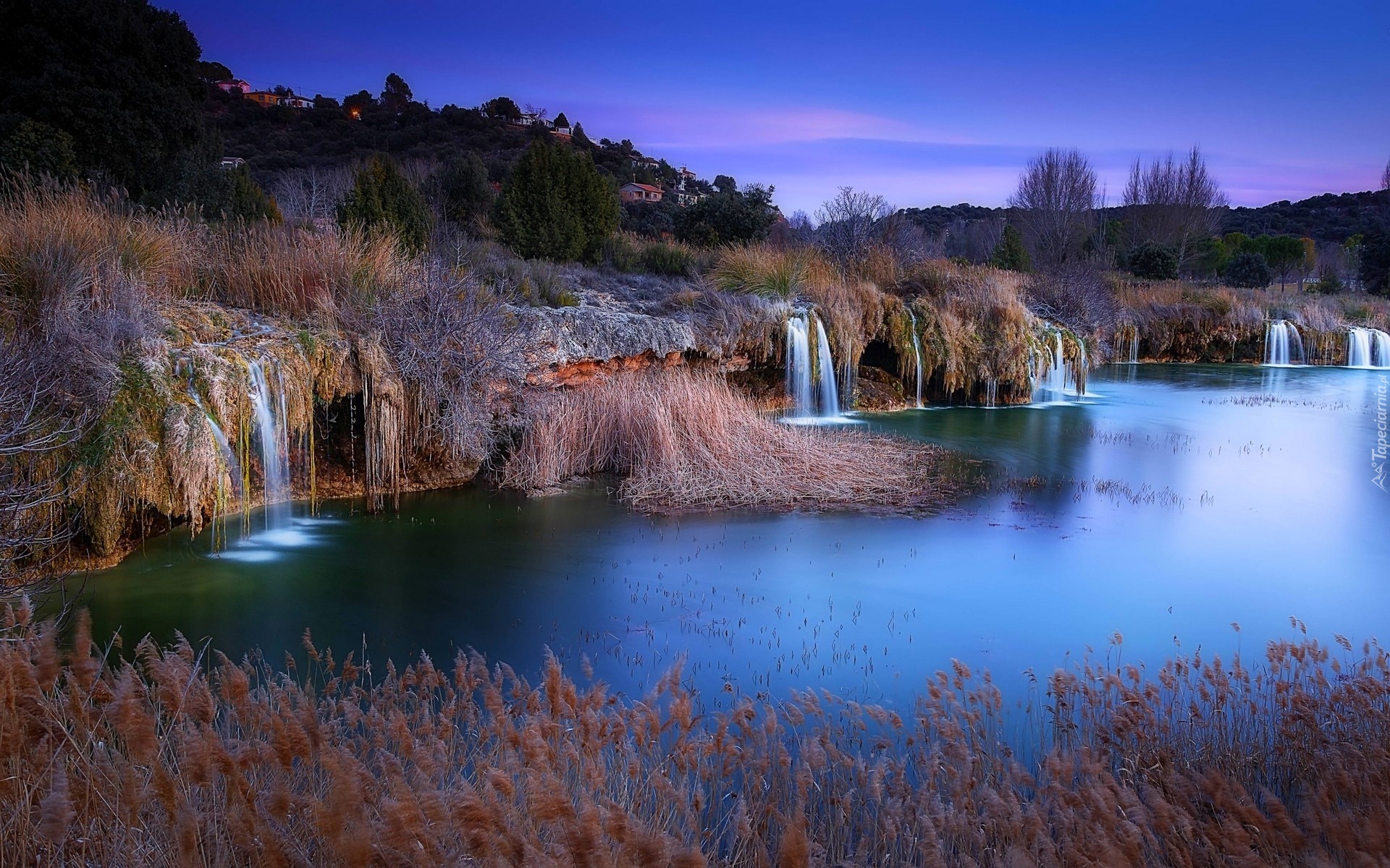 Edytor tapety: Wzgórze, Jezioro, Domy, Drzewa, Trawy, Wodospady