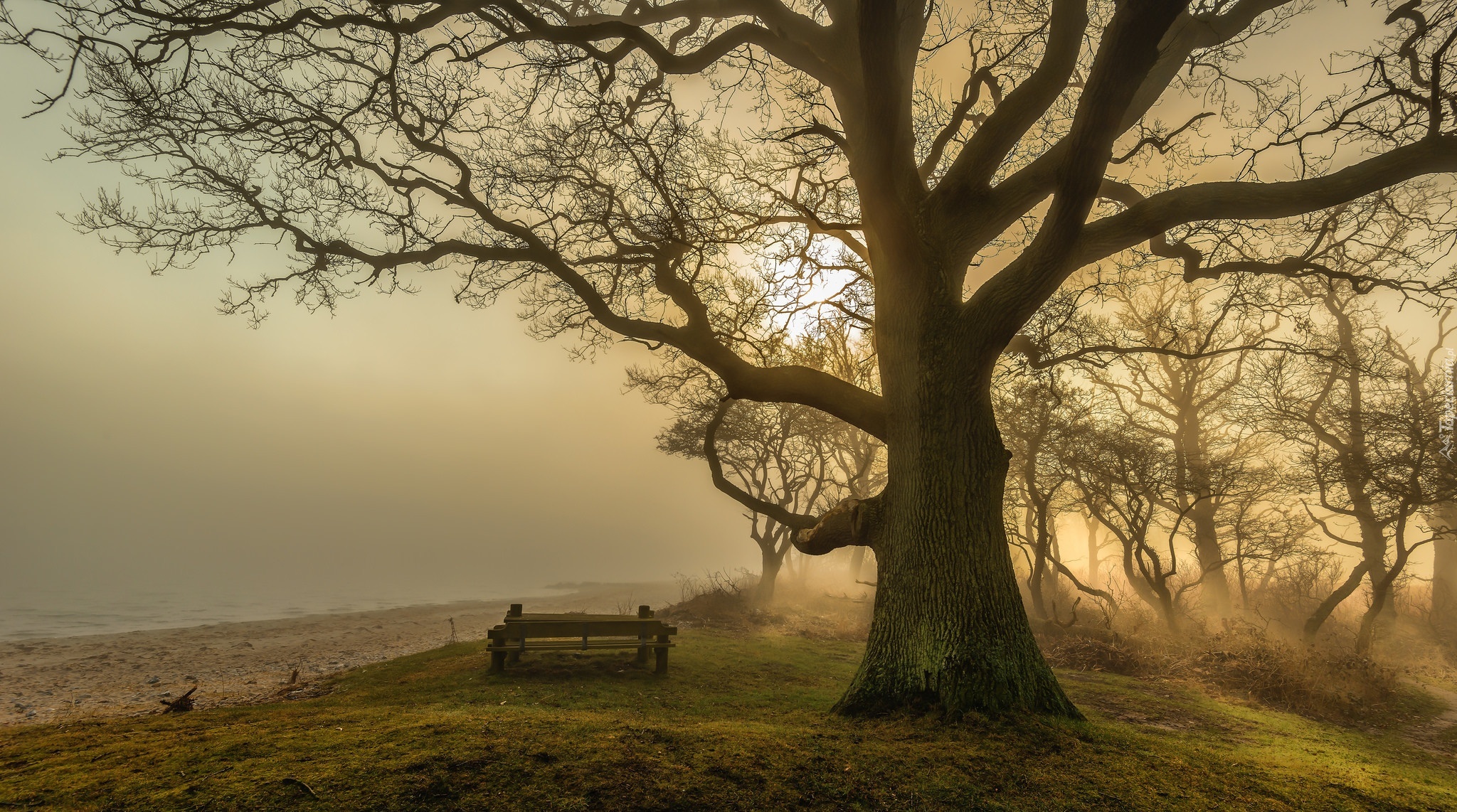 Edytor tapety: Bezlistne, Drzewa, Mgła, Ławeczka, Przebijające, Światło