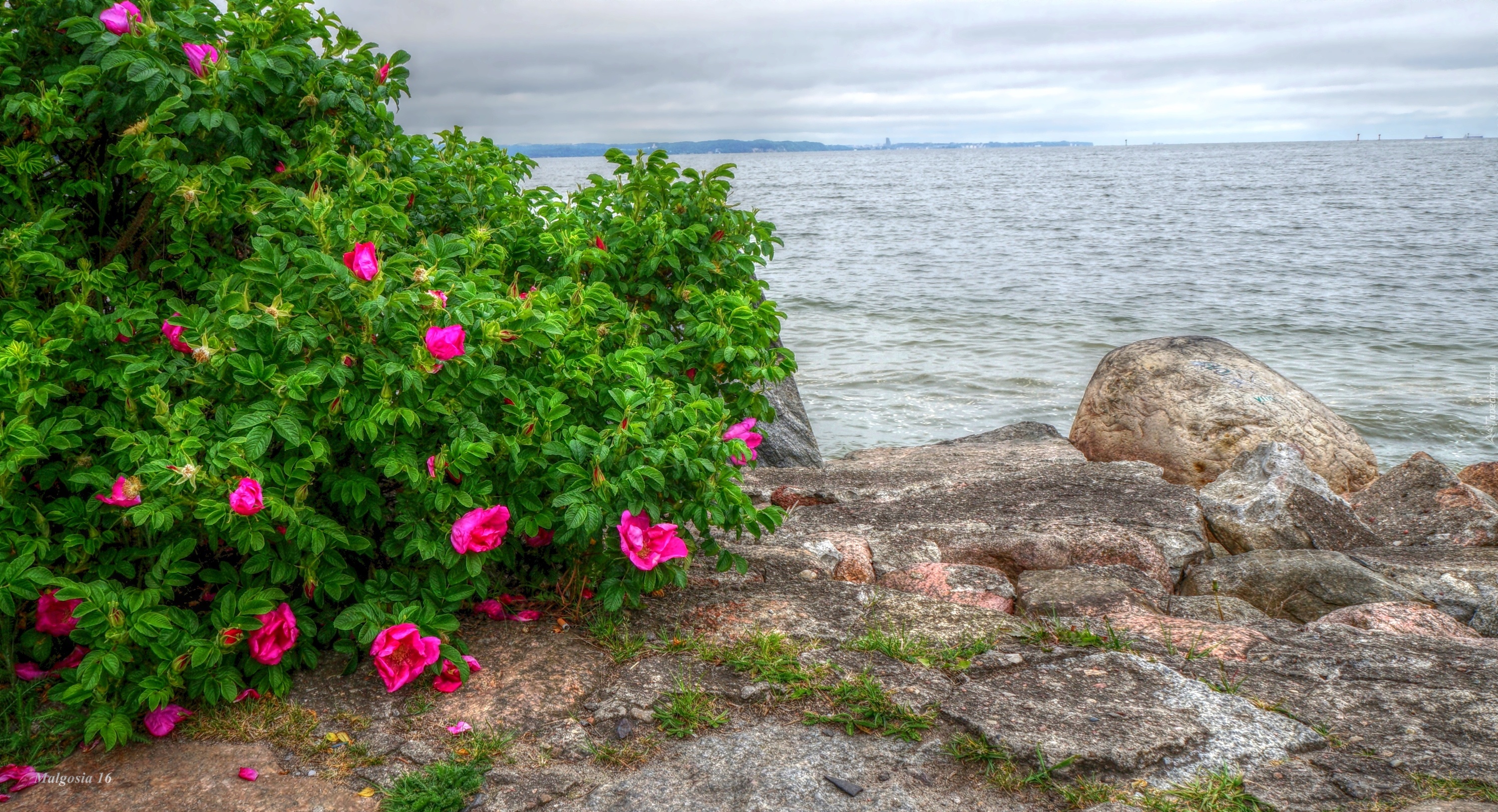 Edytor tapety: Morze, Woda, Kamienie, Dzika Róża, Kwiaty, HDR