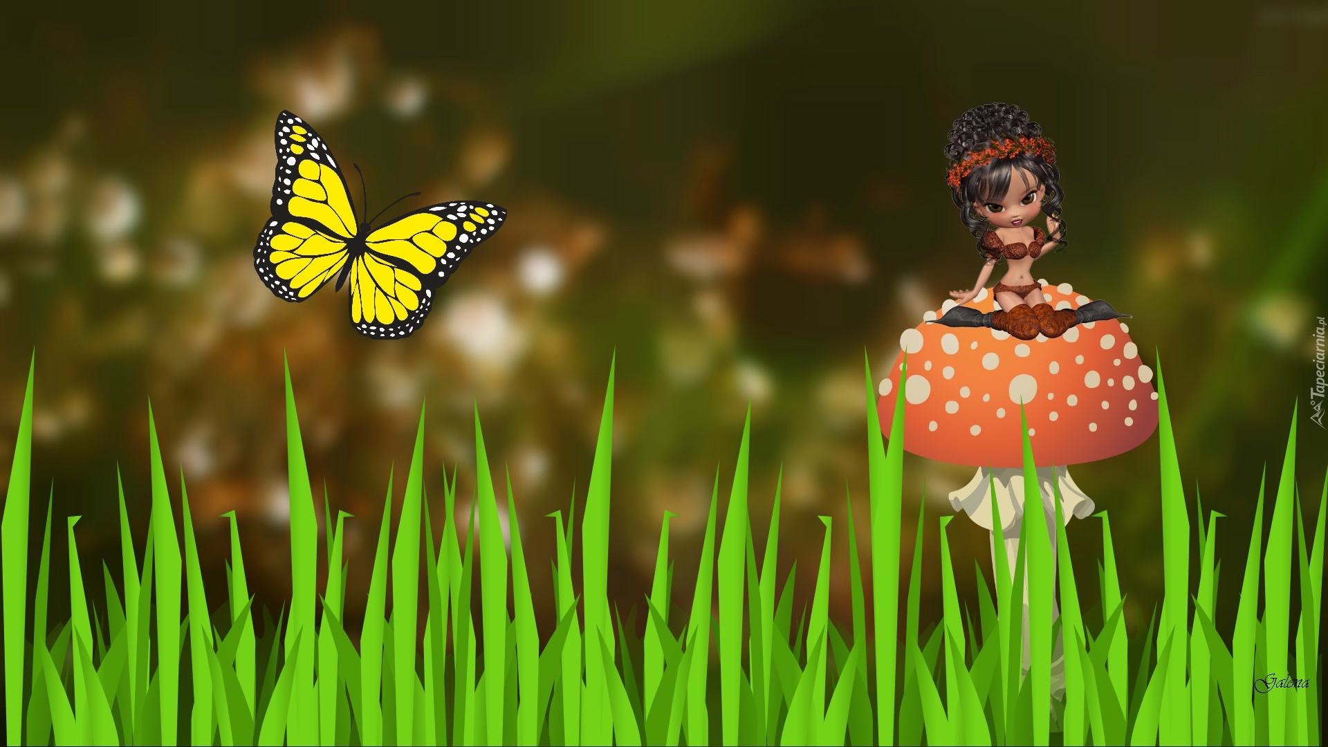 Edytor tapety: Grzyb, Motyl, Trawa, Laleczka, Grafika