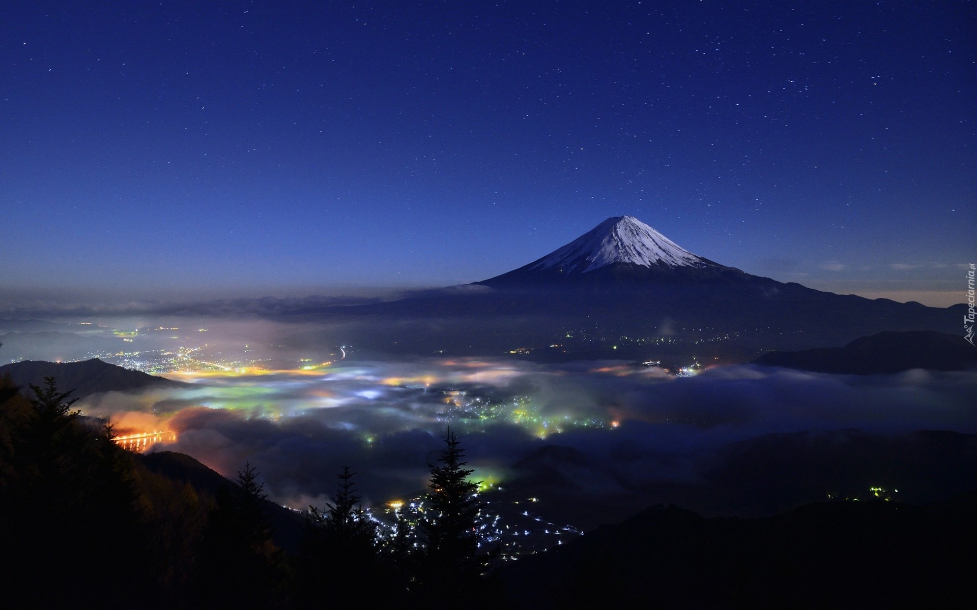 Edytor tapety: Japonia, Wulkan, Fudżi, Noc, Miasto, Mgła, Drzewa
