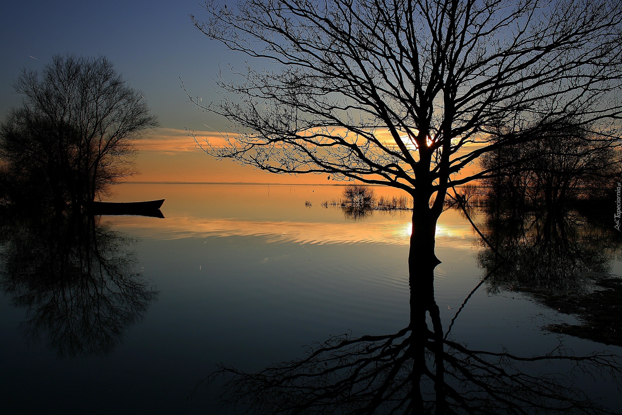 Edytor tapety: Jezioro, Łódka, Drzewa, Odbicie, Zachód, Słońca
