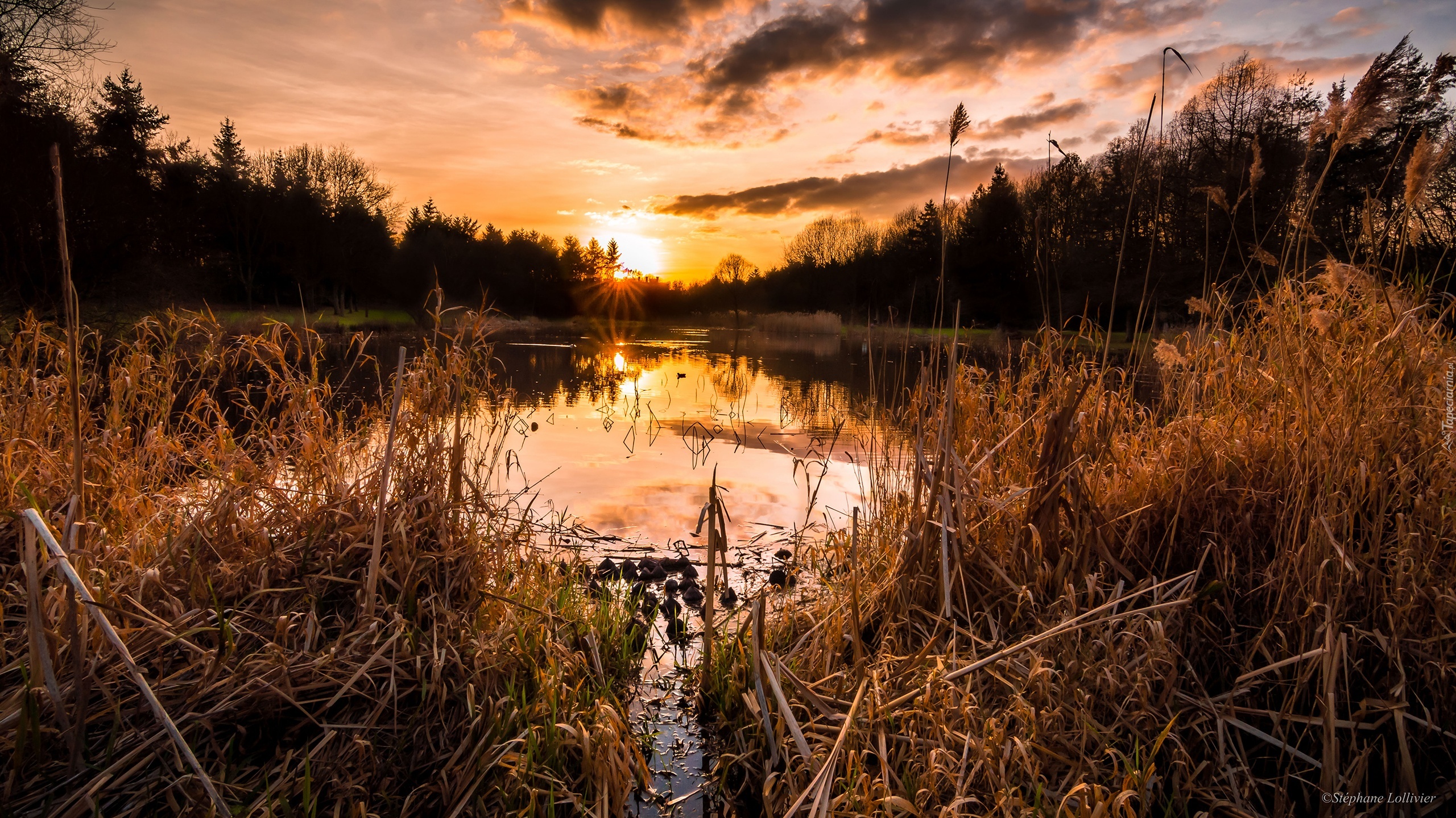 Edytor tapety: Jezioro, Zachód słońca, Chmury, Drzewa