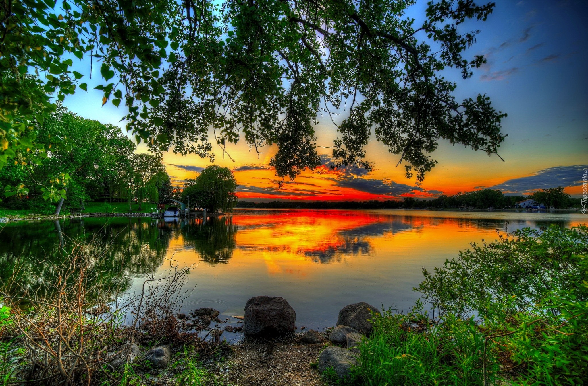Edytor tapety: Jezioro, Zachód słońca, Budynek, Drzewa