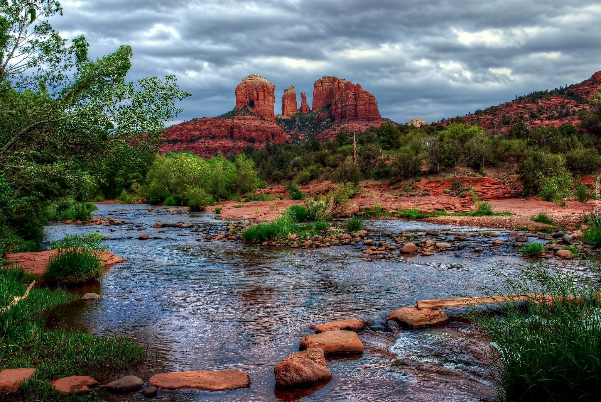 Edytor tapety: Rzeka, Kamienie, Kanion, Skały, Zieleń