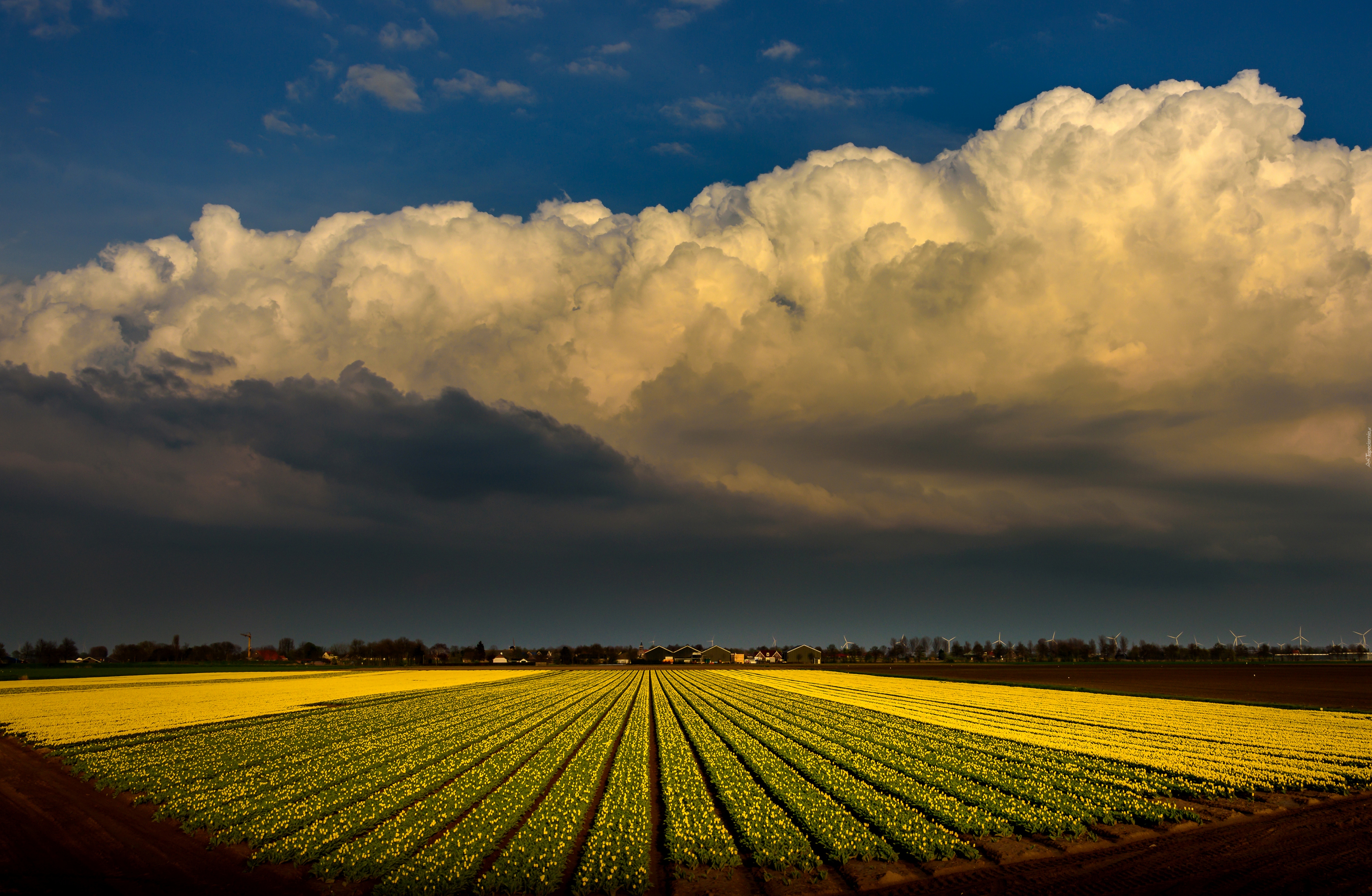 Edytor tapety: Holandia, Pole, Żółte, Tulipany, Chmury