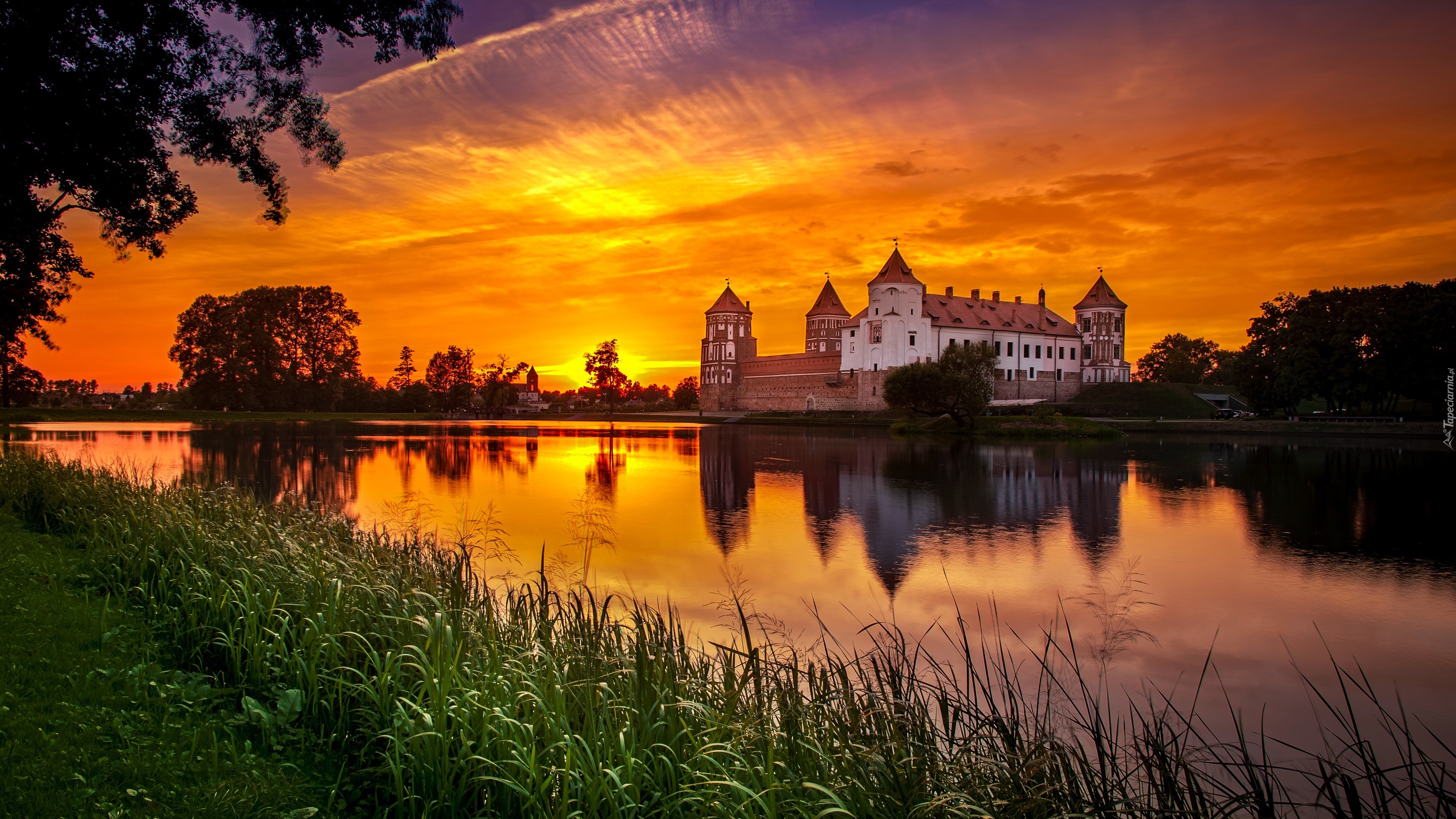 Edytor tapety: Rzeka Miranka, Zamek w Mirze, Białoruś, Zachód słońca