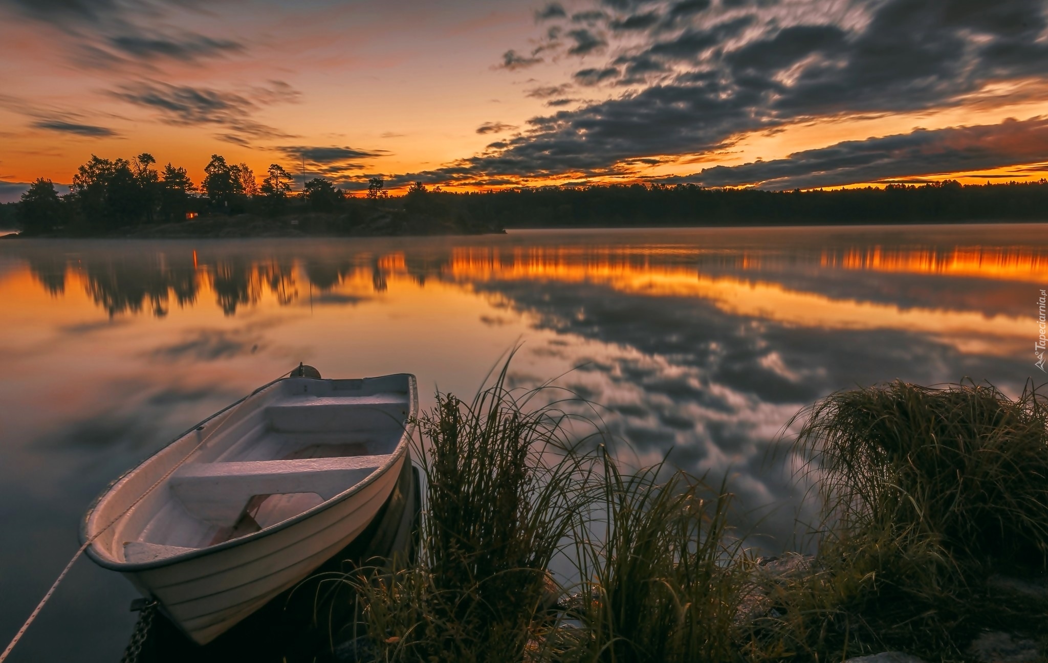 Edytor tapety: Jezioro, Łódka, Trawa, Zachód, Słońca, Chmury