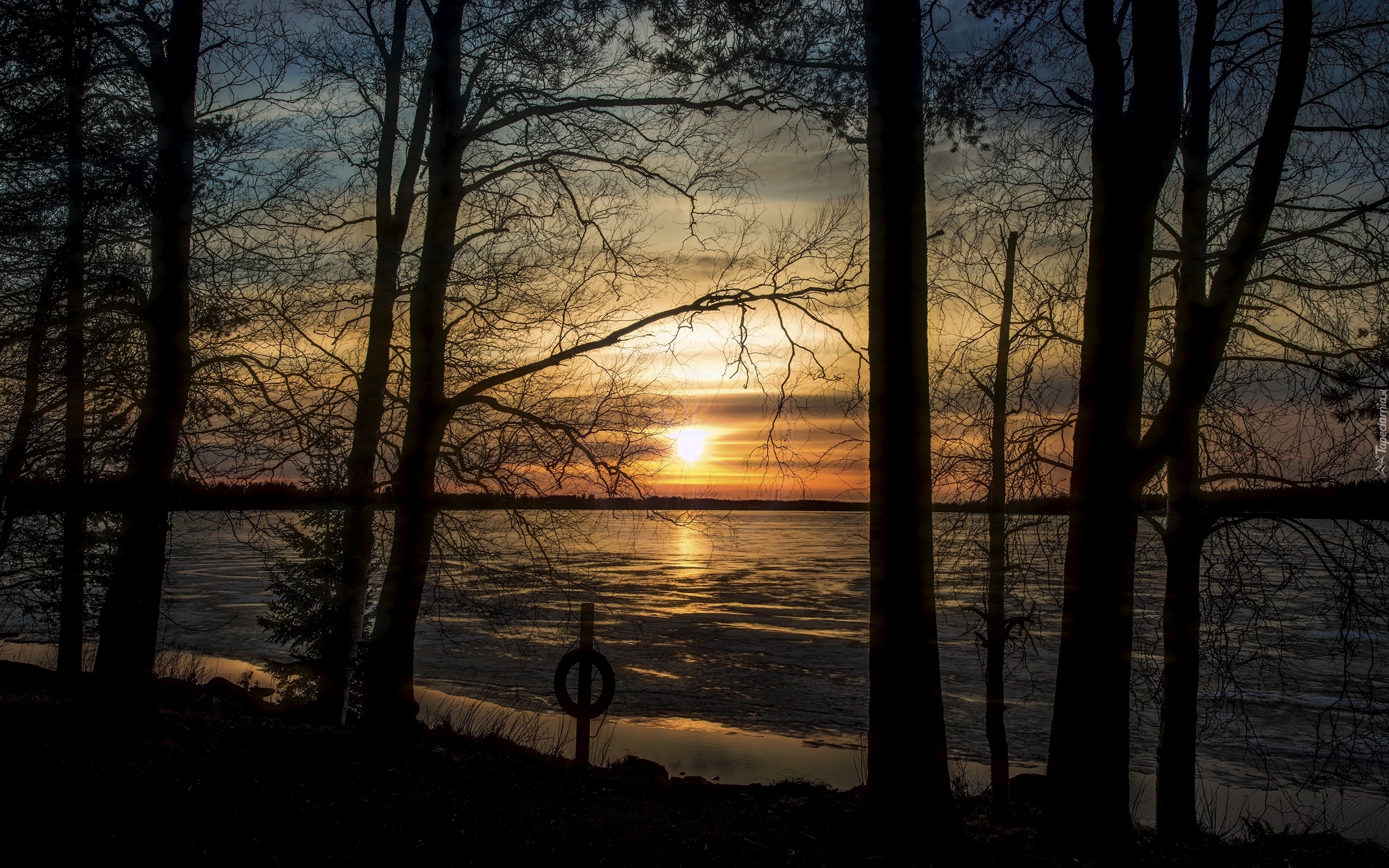 Edytor tapety: Jezioro, Zachód słońca, Drzewa