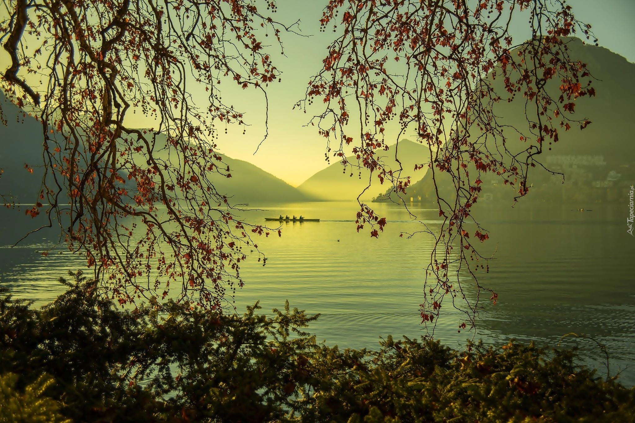 Edytor tapety: Jezioro, Łódki, Ludzie, Góry, Drzewa, Świt