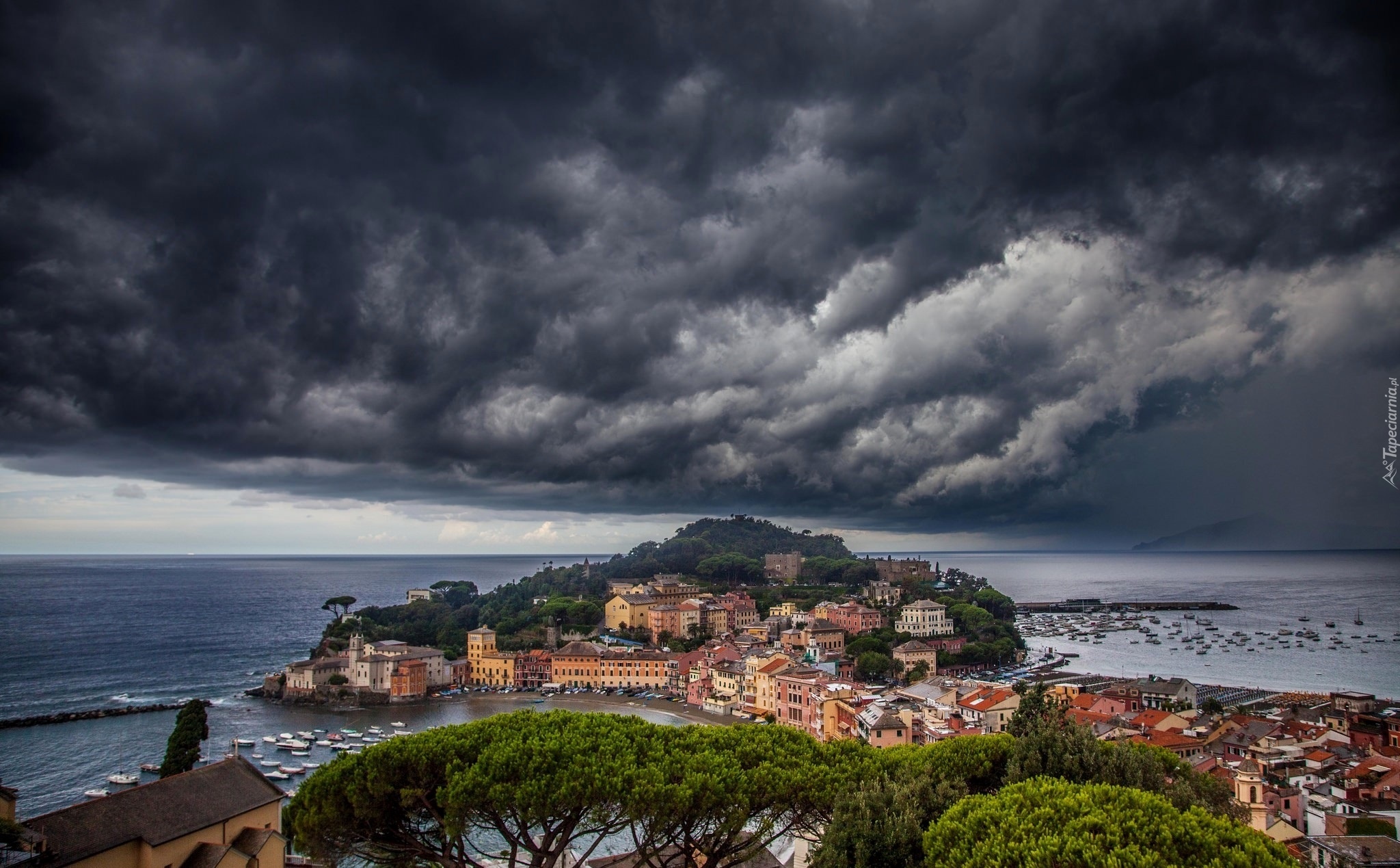 Edytor tapety: Morze, Miasto, Chmury, Wierzchołki, Drzew