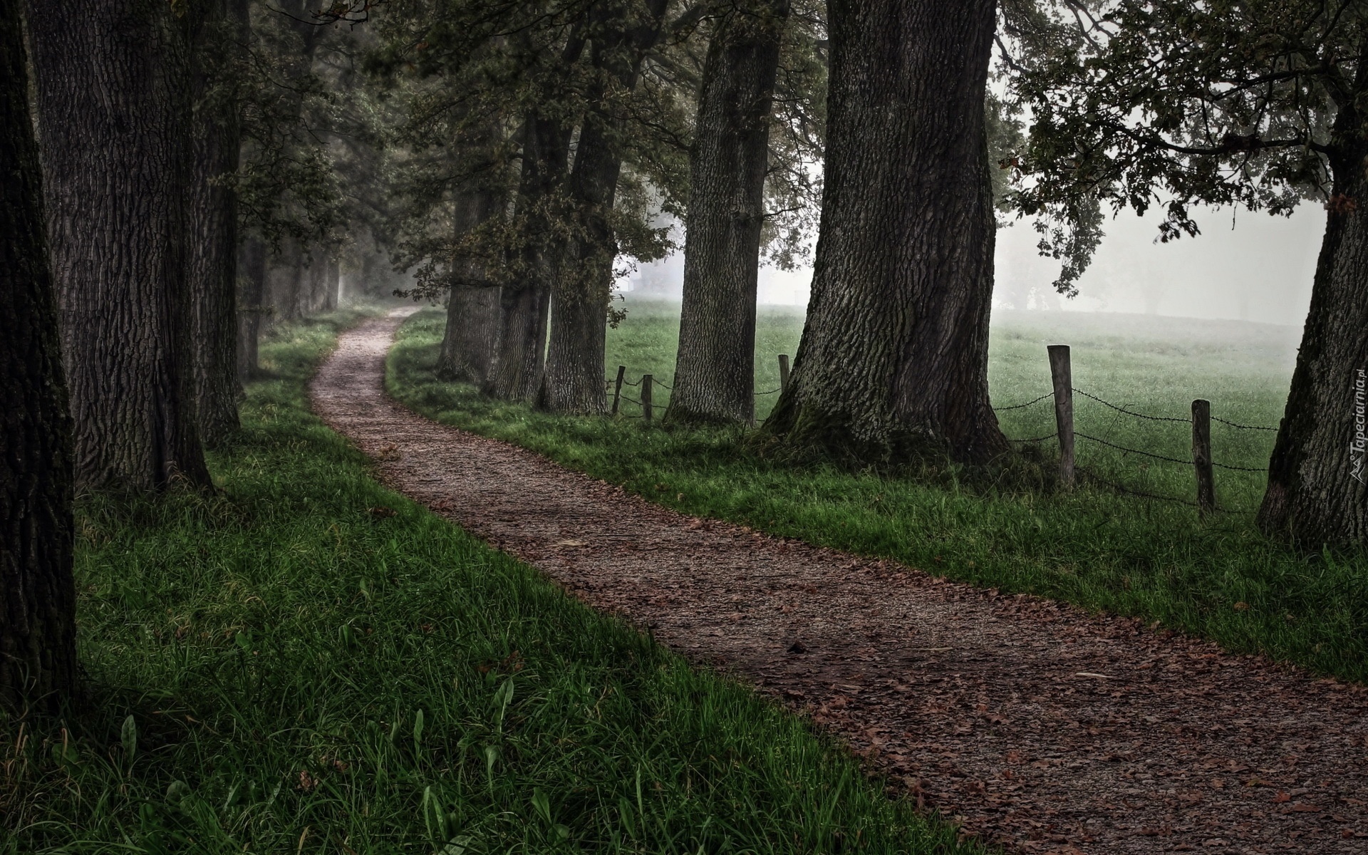 Edytor tapety: Droga, Drzewa, Trawa, Mgła