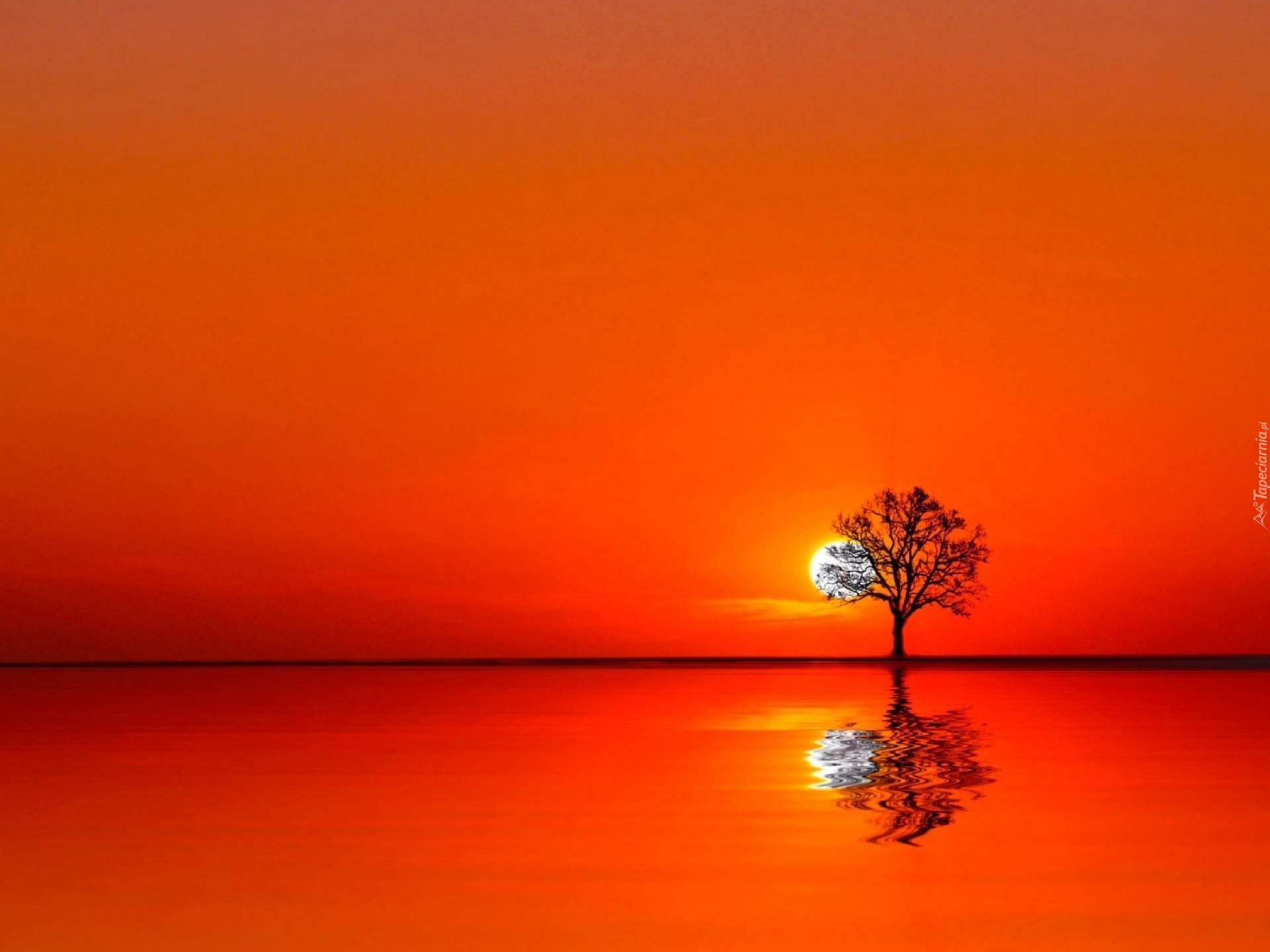 Edytor tapety: Zachód, Słońca, Jezioro, Drzewo, Odbicie
