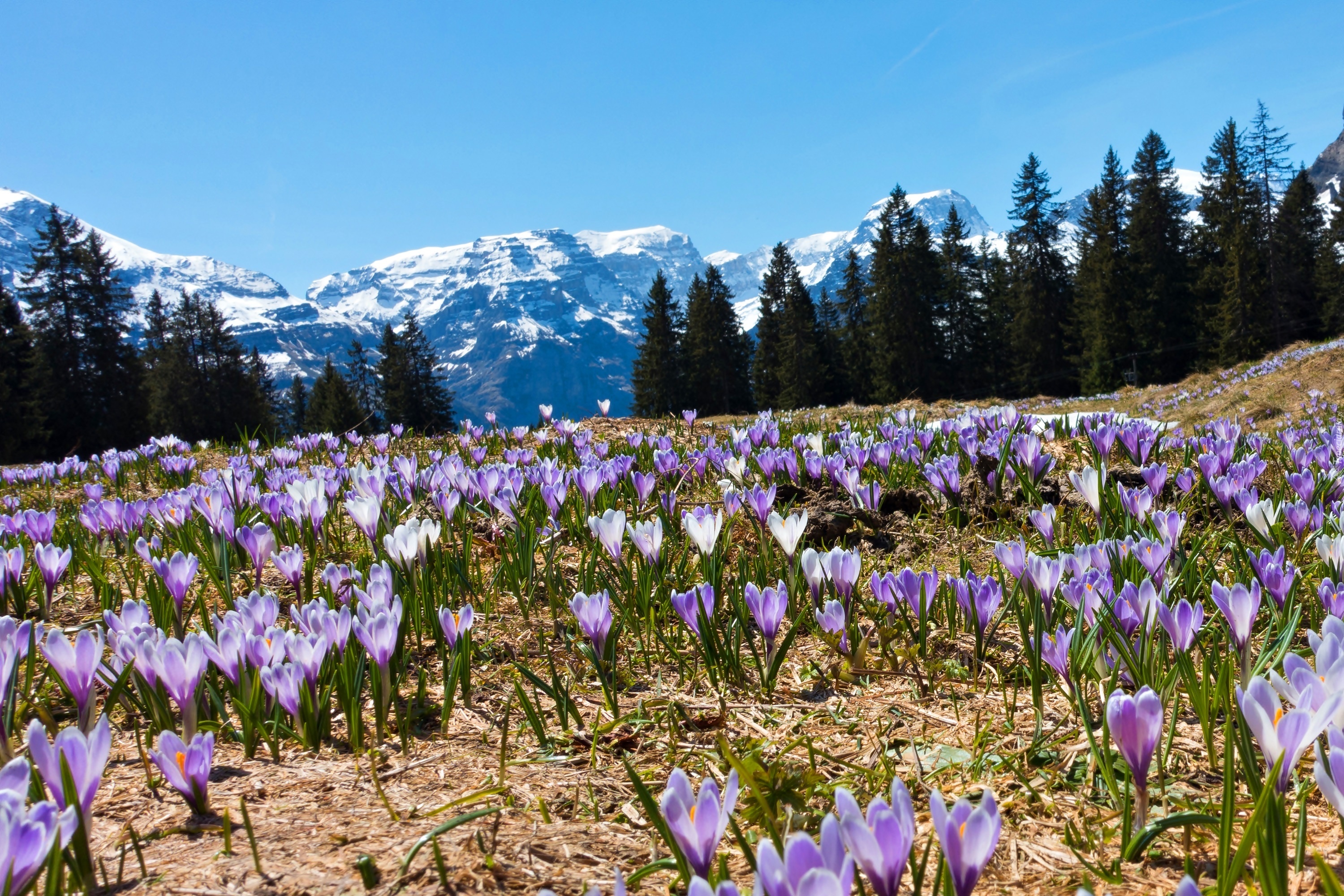 Edytor tapety: Wiosna, Góry, Świerki, Łąka, Krokusy