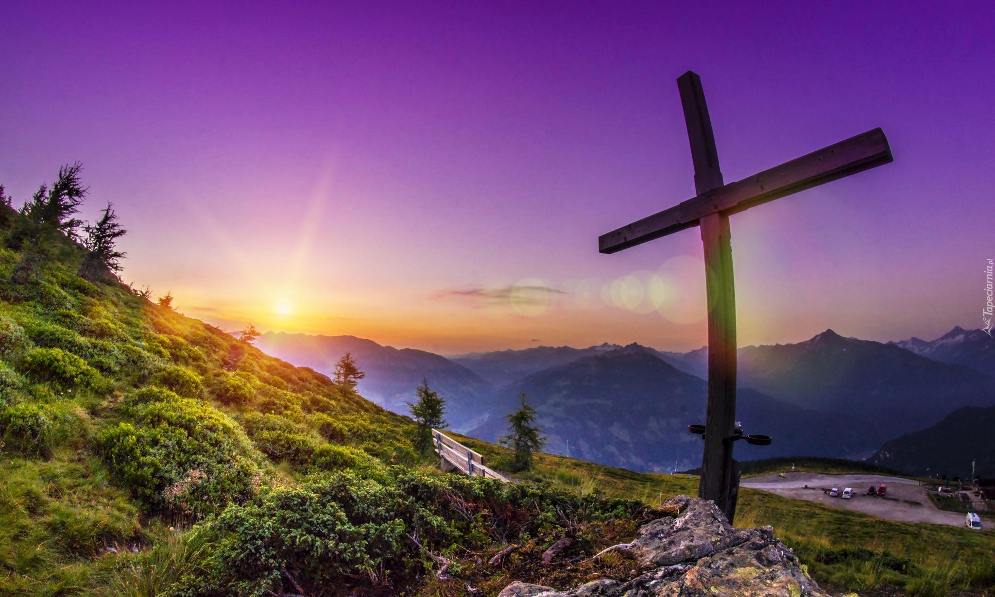 Edytor tapety: Wschód Słońca, Wzgórza, Krzyż, Ławka