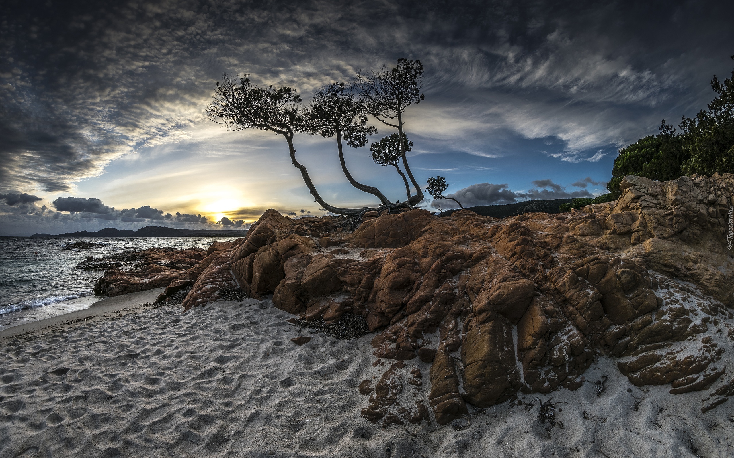 Edytor tapety: Morze, Niebo, Drzewo, Wschód słońca, Chmury