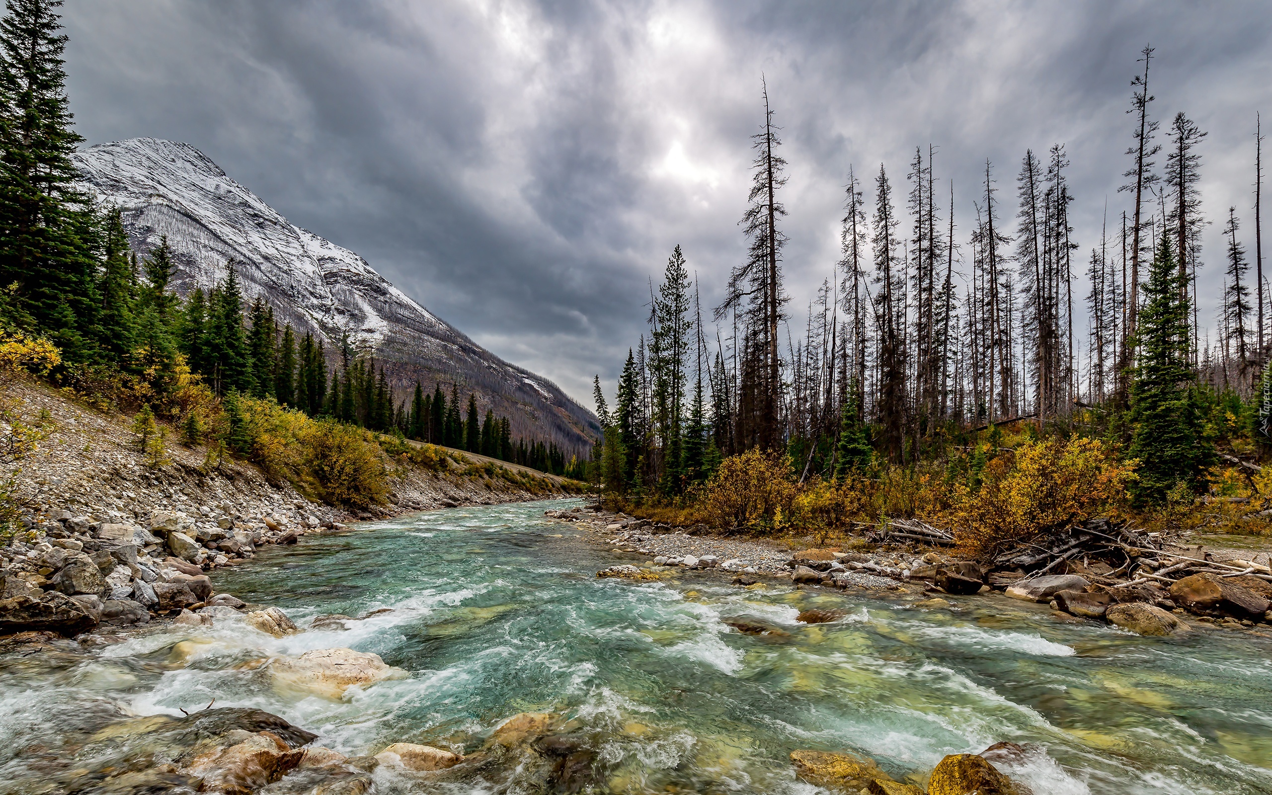 Edytor tapety: Góry, Rzeka, Drzewa, Kamienie, Niebo
