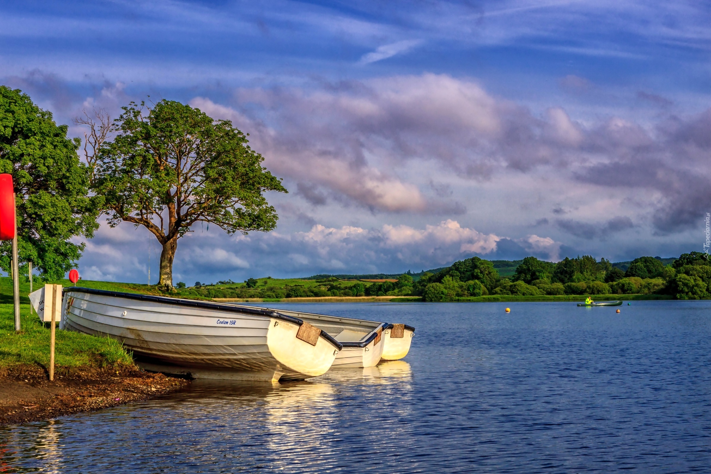 Edytor tapety: Szkocja, Jezioro Loch Ken, Drzewa, Łódki, Brzeg