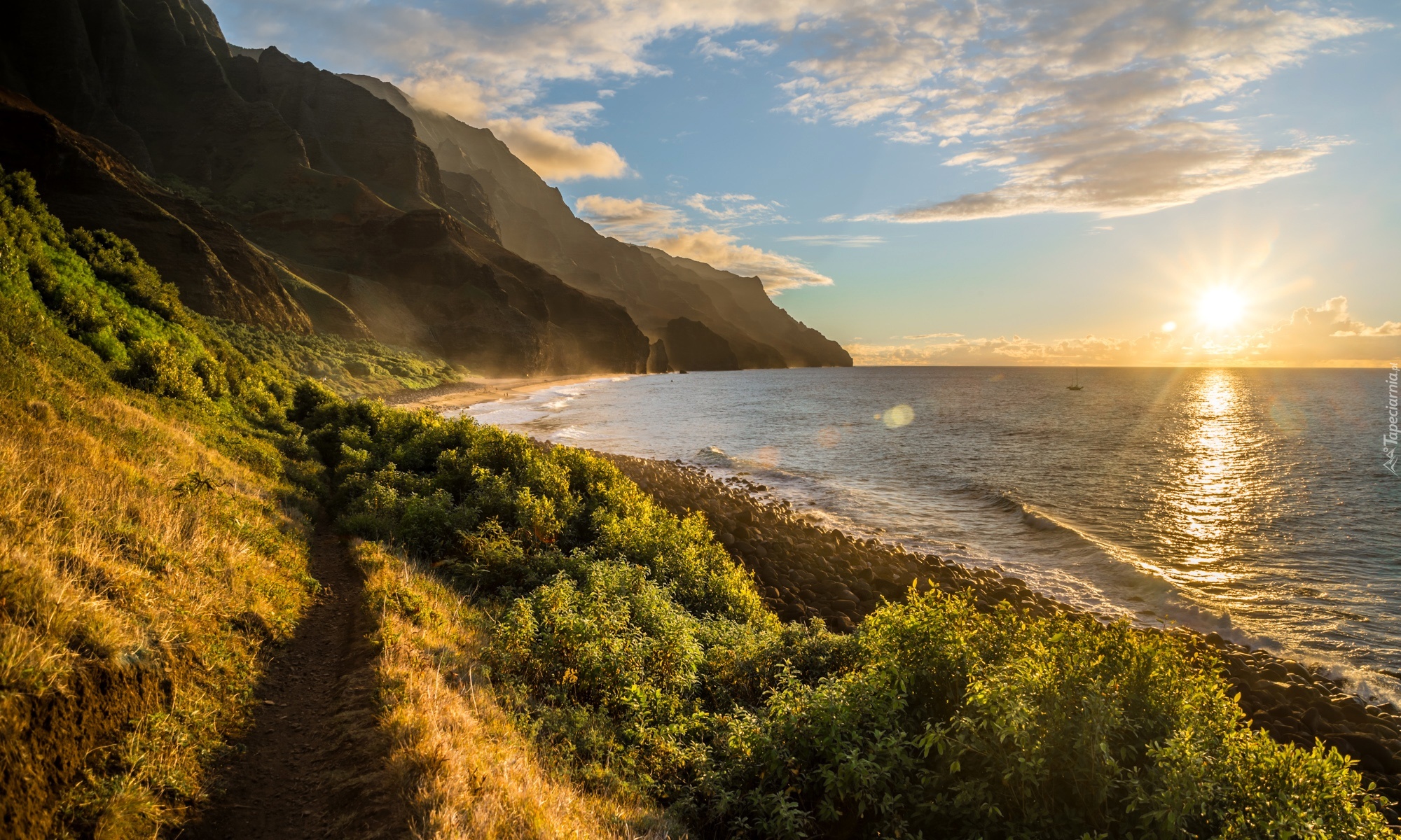 Edytor tapety: Morze, Wschód, Słońca, Góry, Ścieżka, Wybrzeże