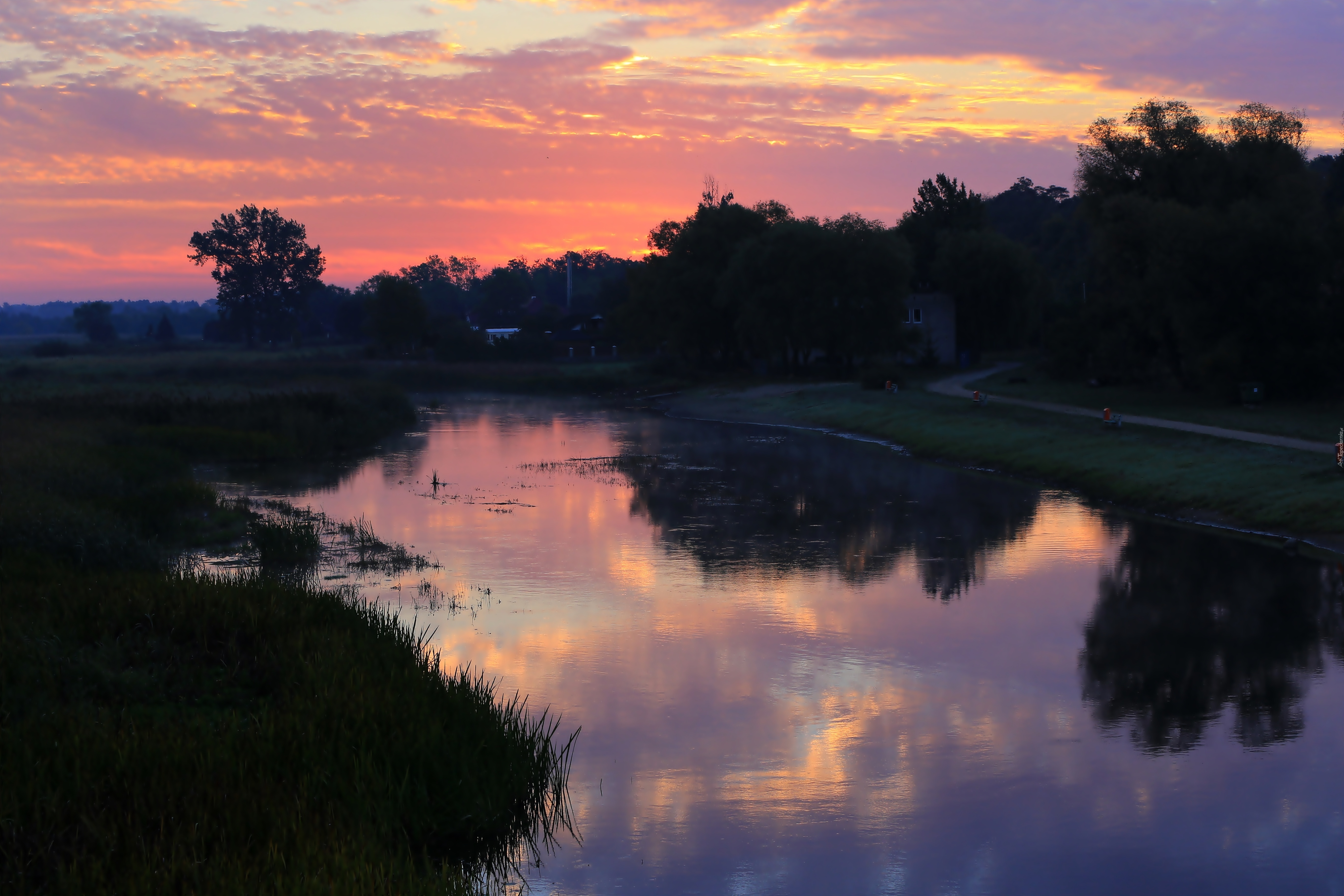 Edytor tapety: Zachód, Słońca, Niebo, Chmury, Jezioro, Odbicie, Drzewa