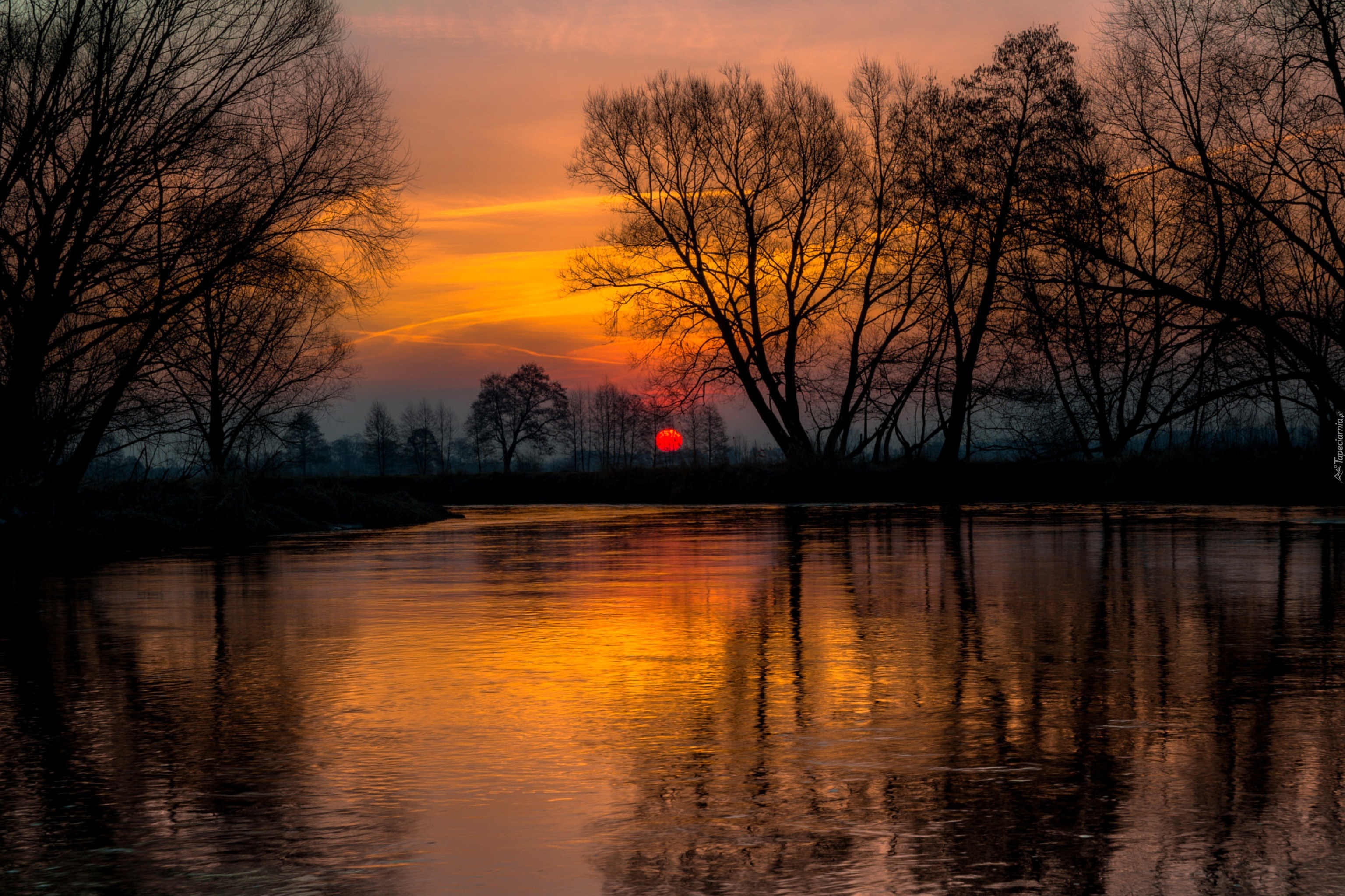 Edytor tapety: Zachód, Słońca, Jezioro, Drzewa, Odbicie