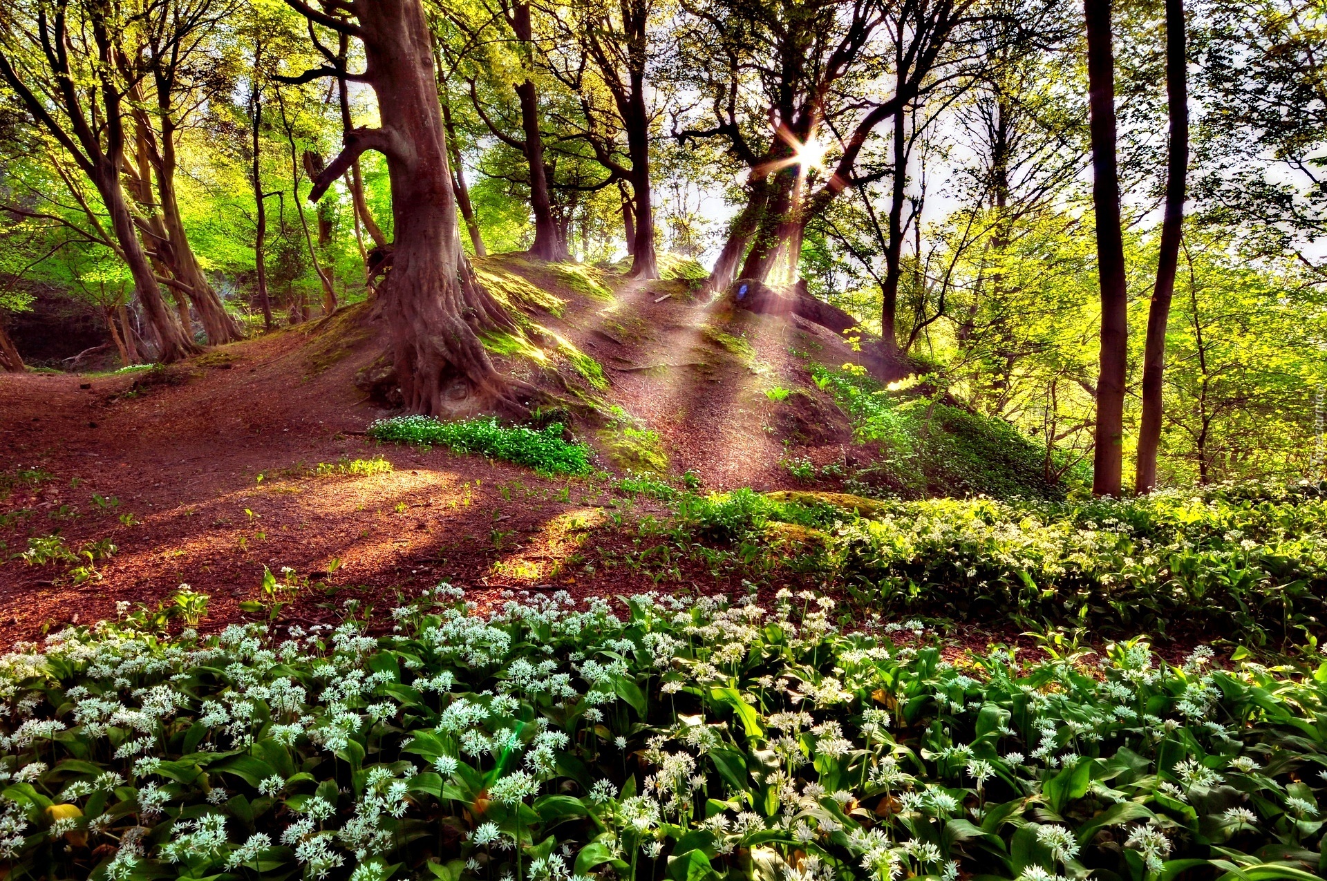 Edytor tapety: Wiosna, Las, Wschód słońca, Kwiaty, Promienie