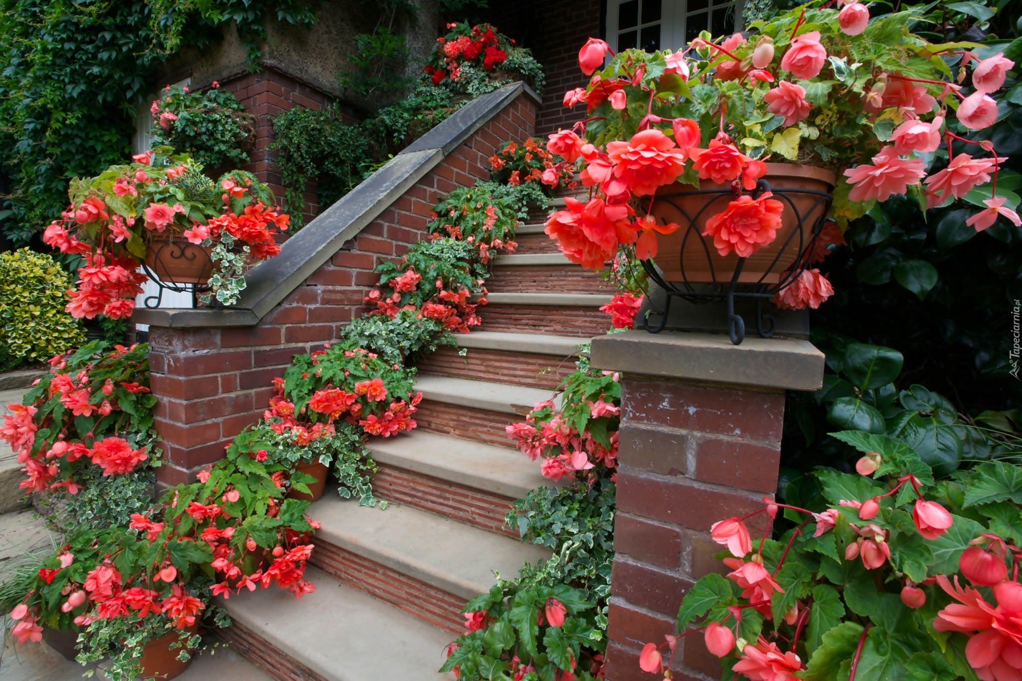 Edytor tapety: Ogród, Dom, Schody, Dekoracja, Kwiaty, Begonie