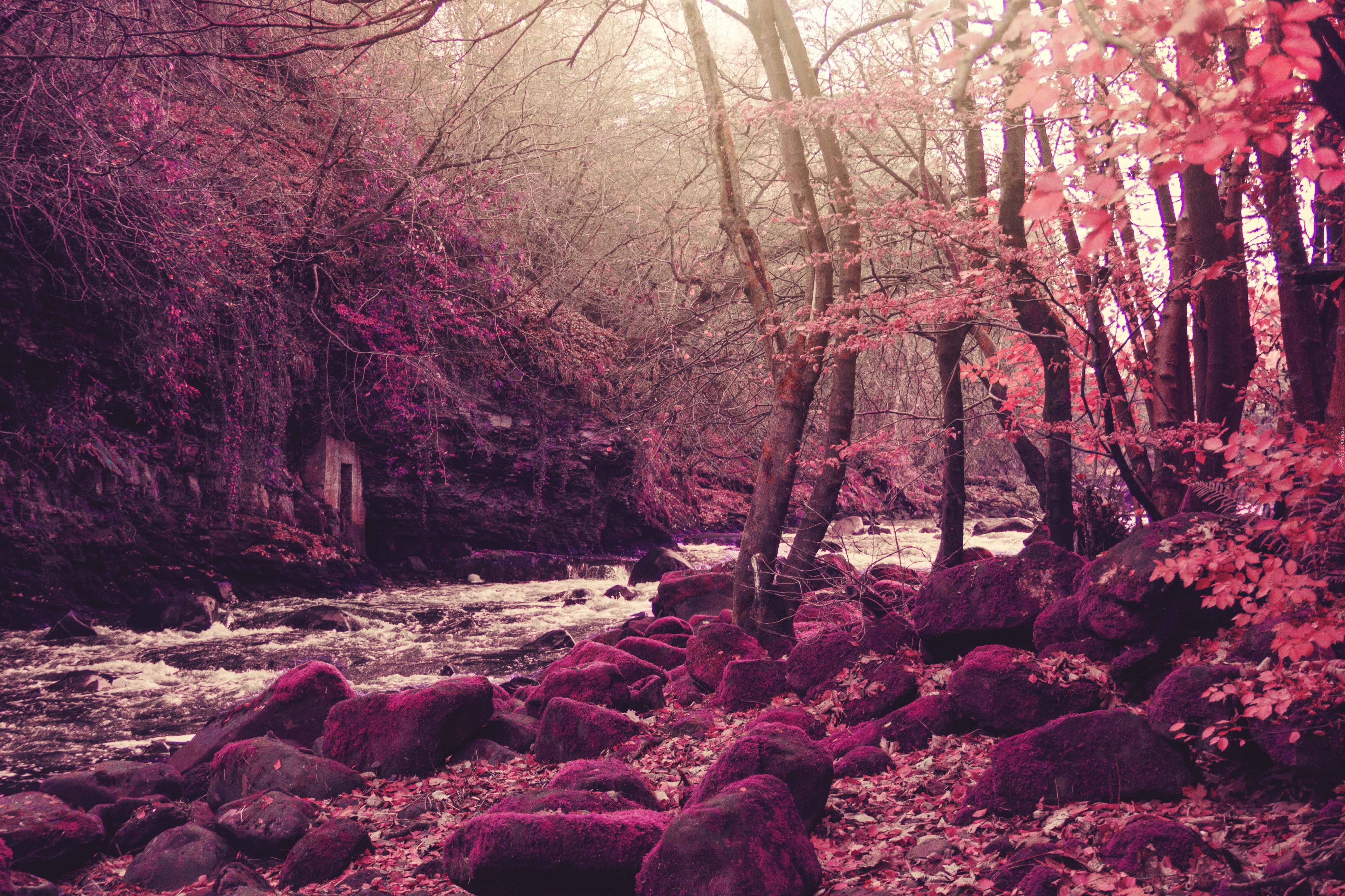 Edytor tapety: Fioletowe, Tło, Grota, Rzeka, Drzewa