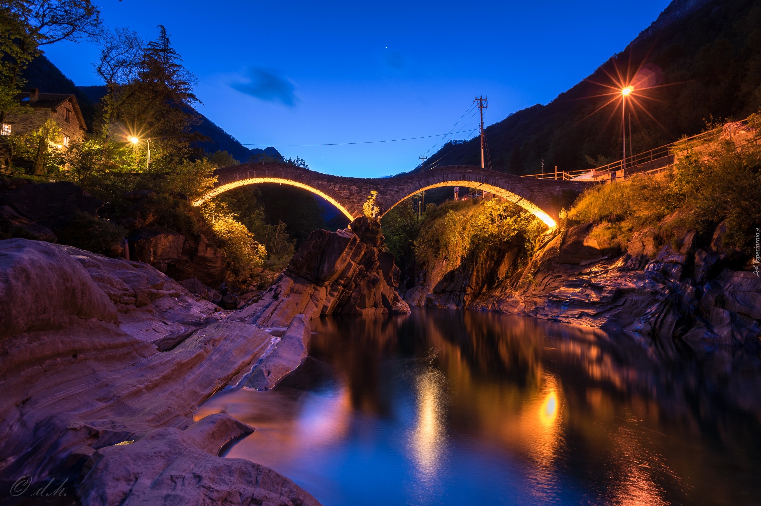 Edytor tapety: Skały, Rzeka, Lampy, Most, Roślinność
